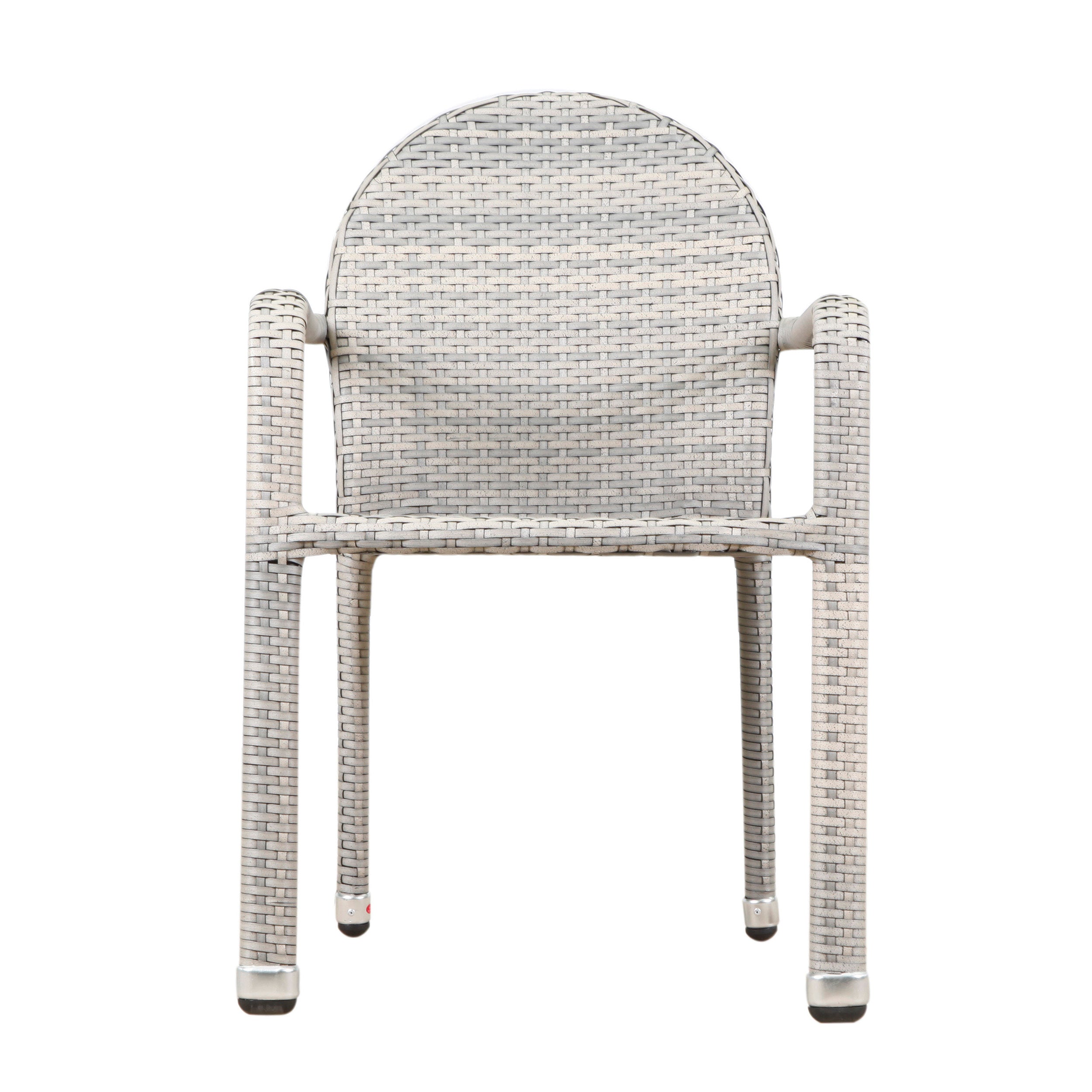 Bring timeless outdoor style and practical function to your patio with this set of two Aurora aluminum-frame wicker dining armchairs. Expertly woven polyethylene rattan over a sturdy aluminum skeleton combines the warm look of wicker with the durability and light weight needed for outdoor living. These stackable dining chairs offer comfortable arm support, easy maintenance, and weather resistance for season-after-season use.