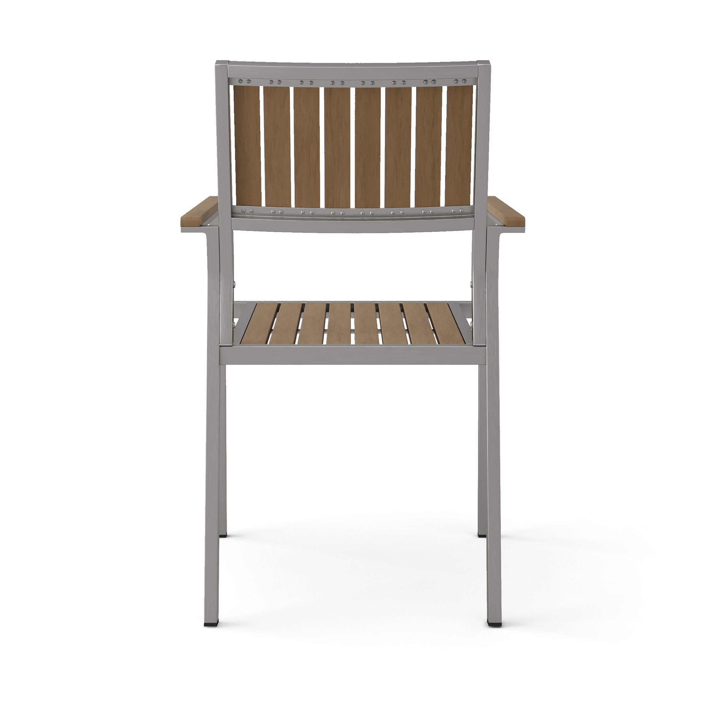 - Offer your backyard space trendy styling, clean design, and durability in one neat package. Our set of dining chairs brings together faux wood with smooth aluminum frames to create a sleek and comfortable space for your backyard or patio. This chair set provides a breezy comfort that offers effortless relaxation while you enjoy an outdoor meal or just unwind during the summer season. With its classic slat design, these chairs will have no problem blending into your outdoor decor with its modern