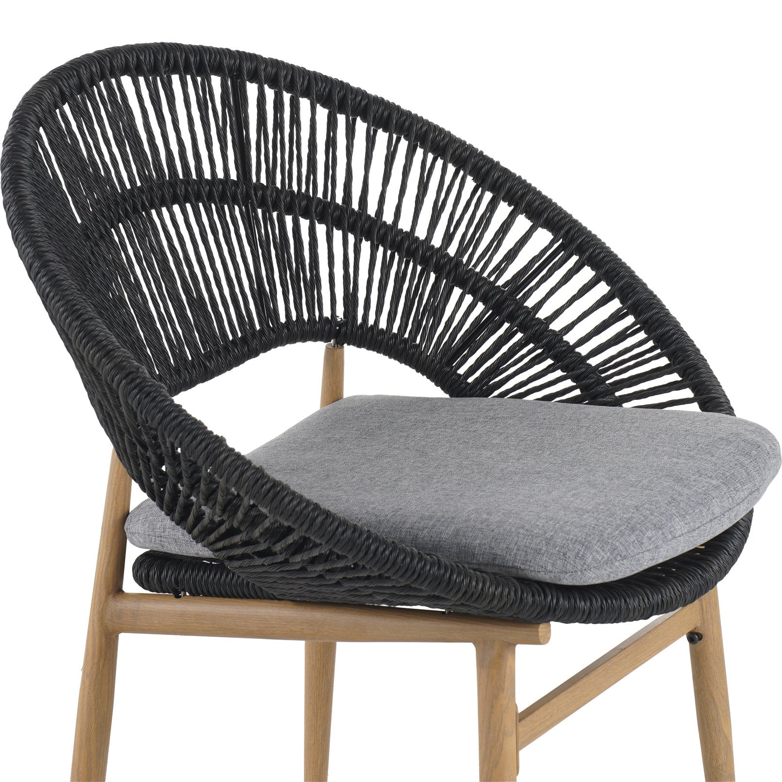 Bring relaxed, contemporary style to your outdoor dining area with this papasan-style wicker chair set. Handwoven faux-rattan and a plush, water-repellent cushion combine with a sturdy powder-coated iron frame and teak-finished legs to create a durable, low-maintenance seating solution that’s as comfortable for long dinners as it is attractive on a patio or balcony.