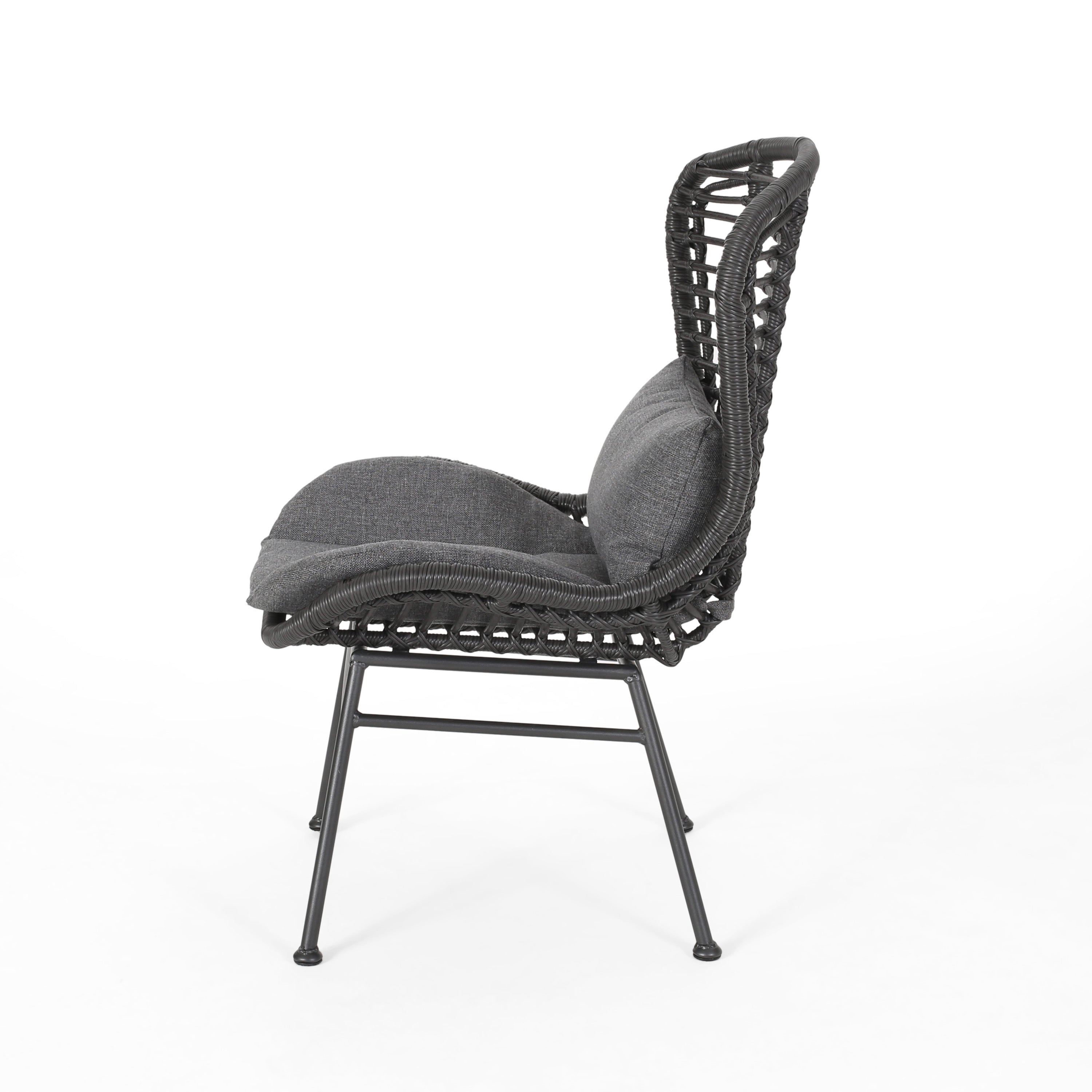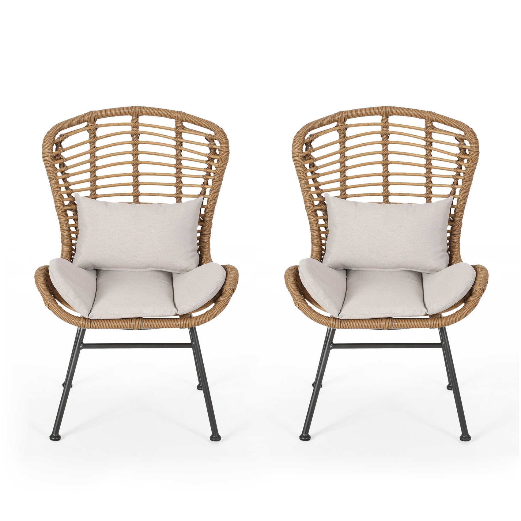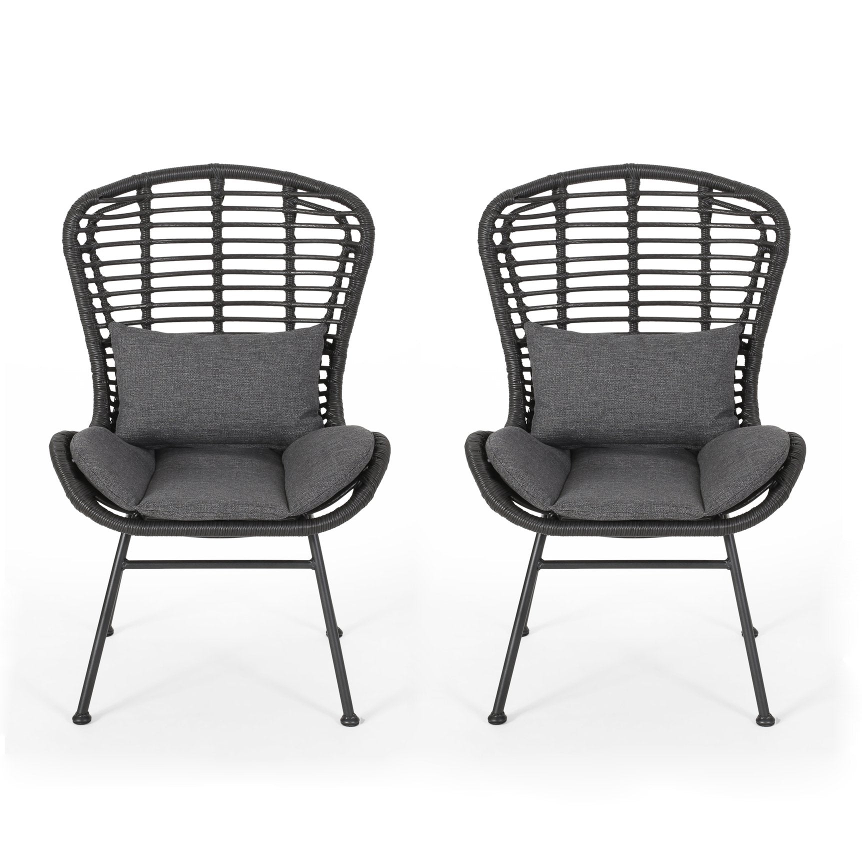 Bring relaxed, modern comfort to your outdoor living space with this stylish two‑chair set. Each chair pairs a durable iron frame with handwoven polyethylene rattan and plush water‑resistant cushions for a cozy, low‑maintenance seating solution that complements patios, decks, and gardens.
