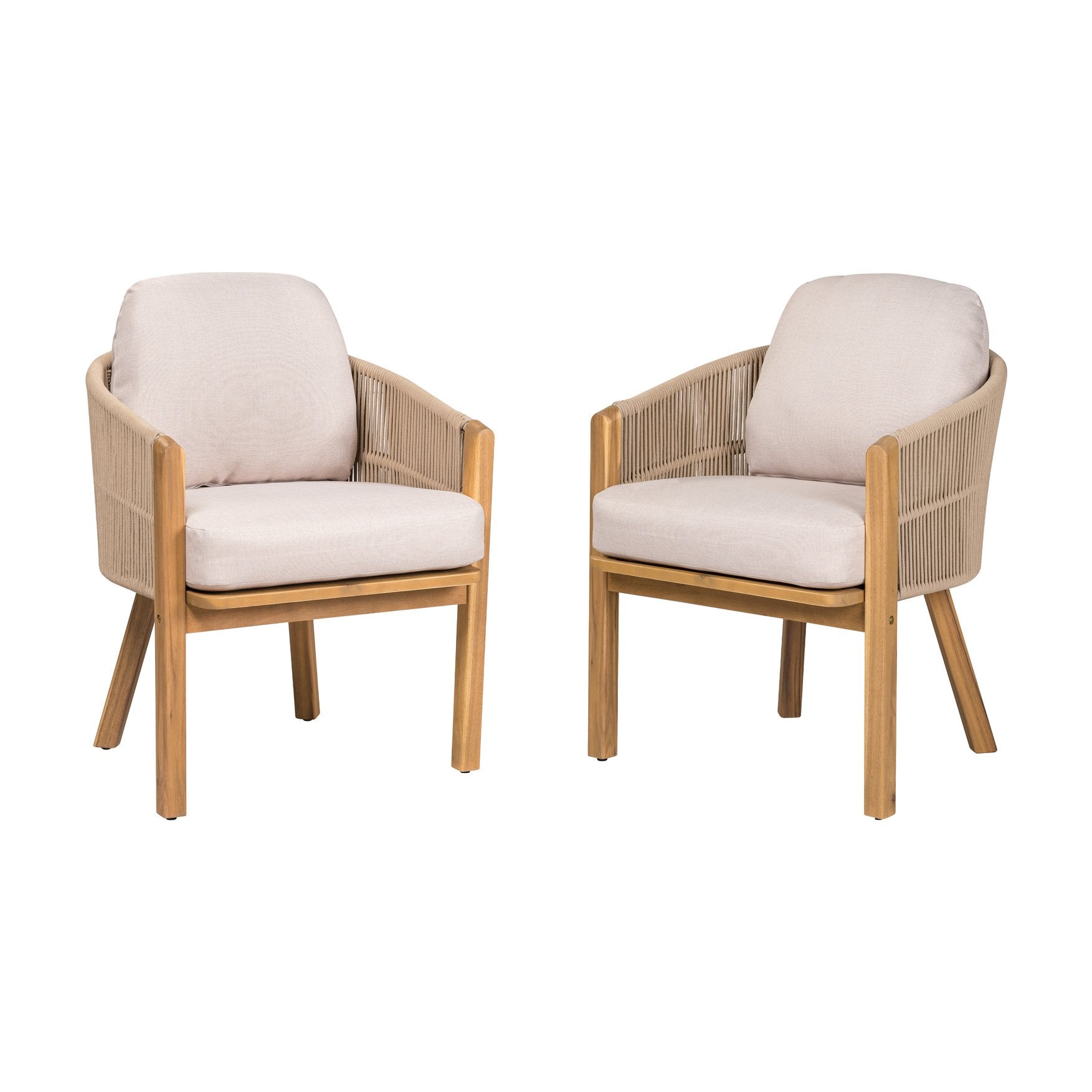 Bring a calm, coastal-inspired touch to your outdoor dining or lounge area with these Grotta arm chairs. Crafted from warm-toned acacia and accented with handwoven rope, each chair blends Scandinavian minimalism with organic, artisanal details for comfortable everyday use and lasting style.