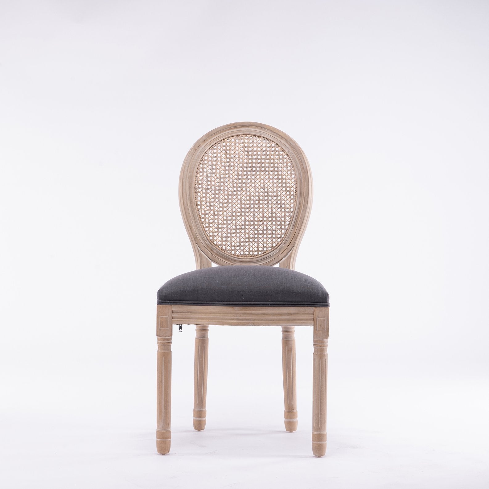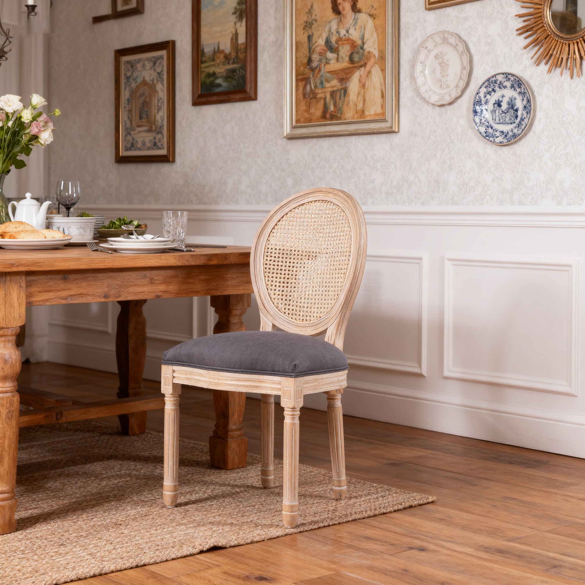 Bring timeless French-country charm to your dining room, kitchen, or cozy corner with this set of 2 vintage-inspired upholstered chairs. Combining rattan detailing, a rounded high back, and solid wood legs, these chairs balance comfort and classic style—ideal for farmhouse, mid-century, or eclectic interiors.