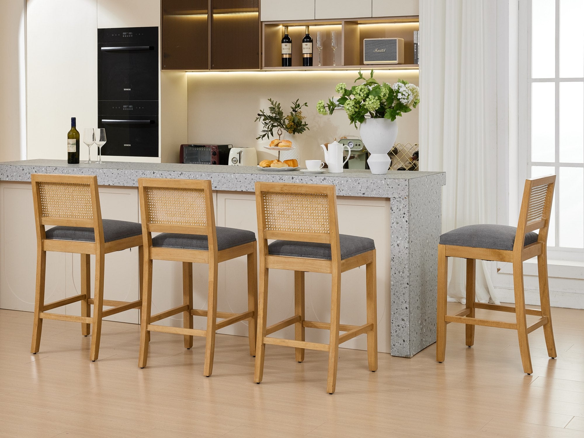 - Ergonomic rattan-back design: Tall, slightly reclined backrest with hollowed rattan-style patterning for improved air circulation and comfortable lumbar support.