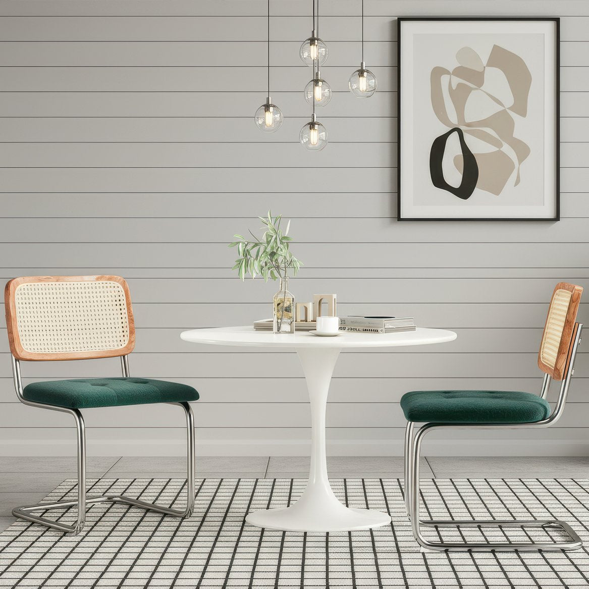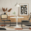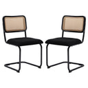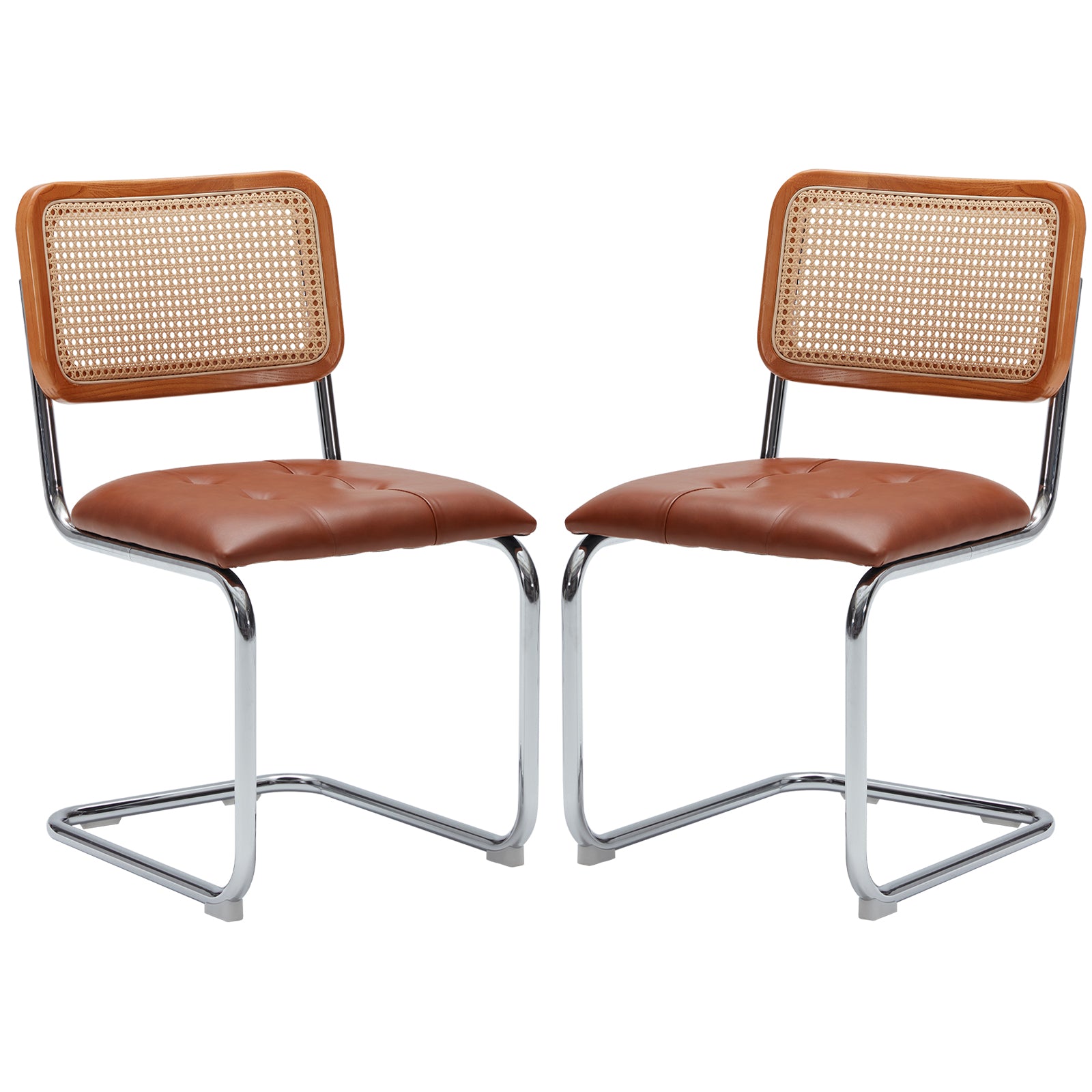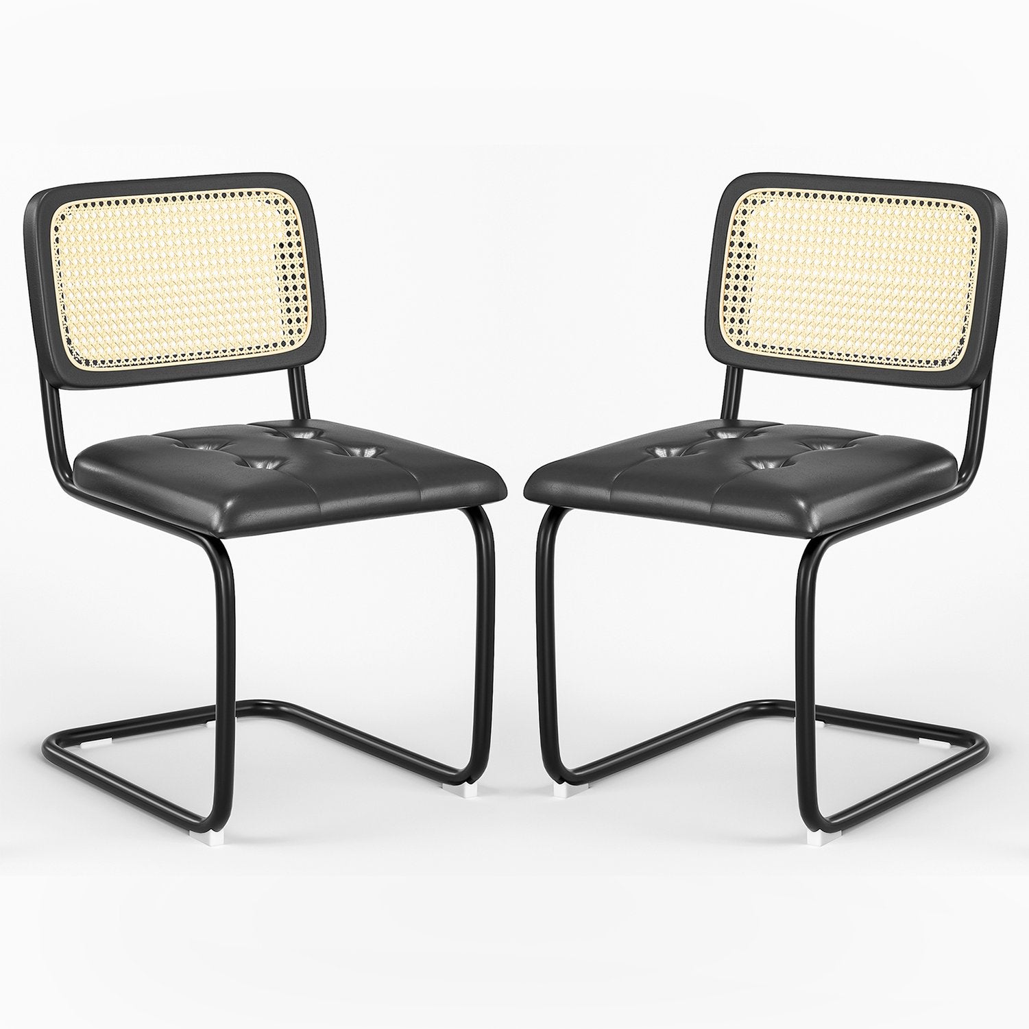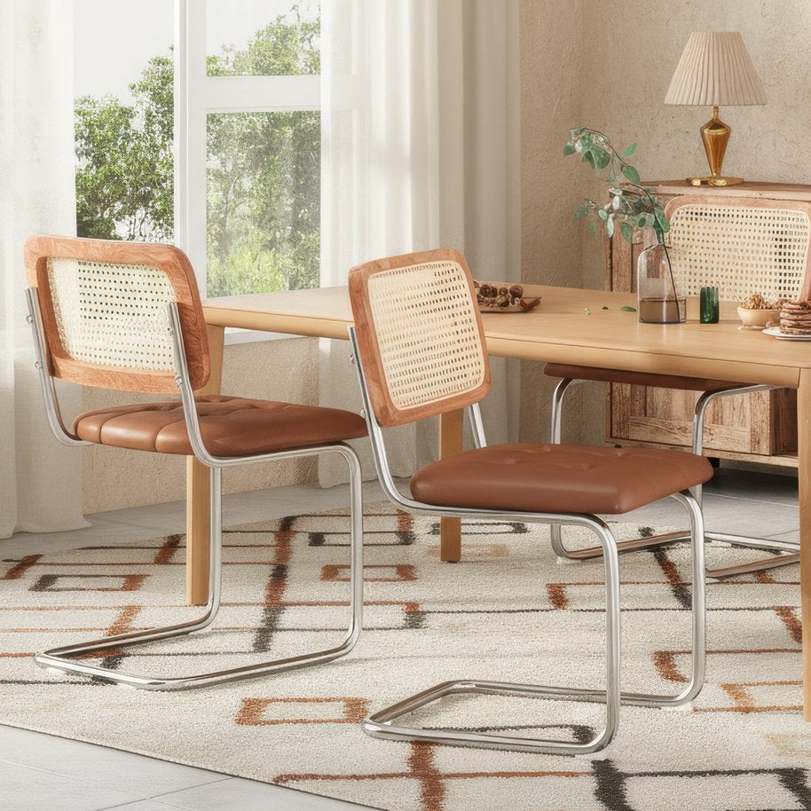 Upgrade your dining space with these sleek Mid-Century Modern armless chairs that blend breathable rattan craftsmanship with comfortable PU upholstery. Designed for everyday use, the cantilevered frame provides a gentle spring and ergonomic support, while the hand-woven rattan back adds texture and visual warmth to contemporary interiors. Each set includes two chairs and all hardware for quick assembly.