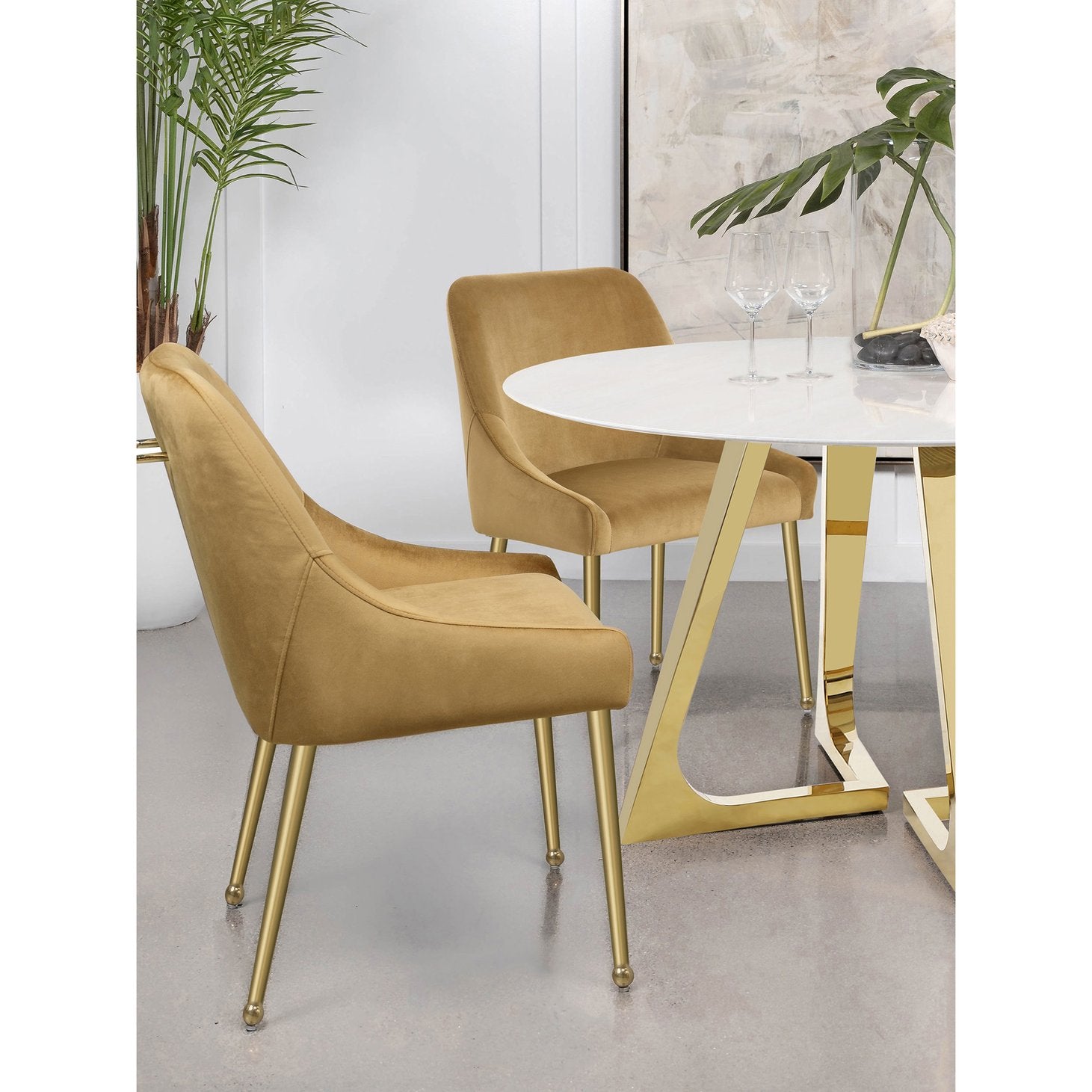 - The chairs feature durable, brass-plated tapered metal legs, combining strength with an elegant finish for a modern, stylish look