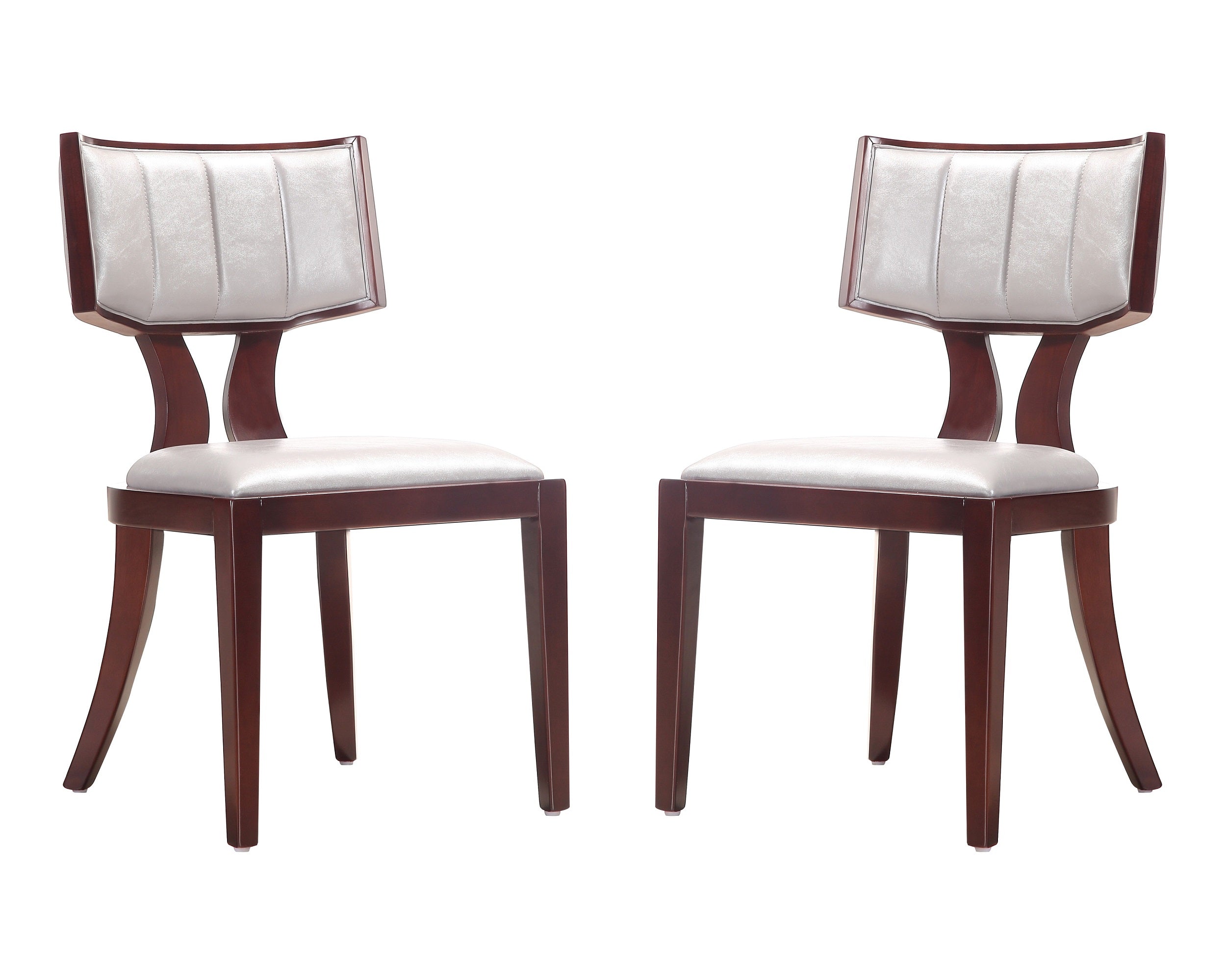 Elevate your dining space with these elegant Pulitzer Wood dining chairs—crafted for comfort, style, and durability. The silver vegan leather upholstery and classic Klismos silhouette bring a refined, modern touch, while solid beech wood construction and plush foam padding ensure lasting support for everyday meals or special gatherings. Delivered fully assembled, these chairs are ready to enhance your room the moment they arrive.