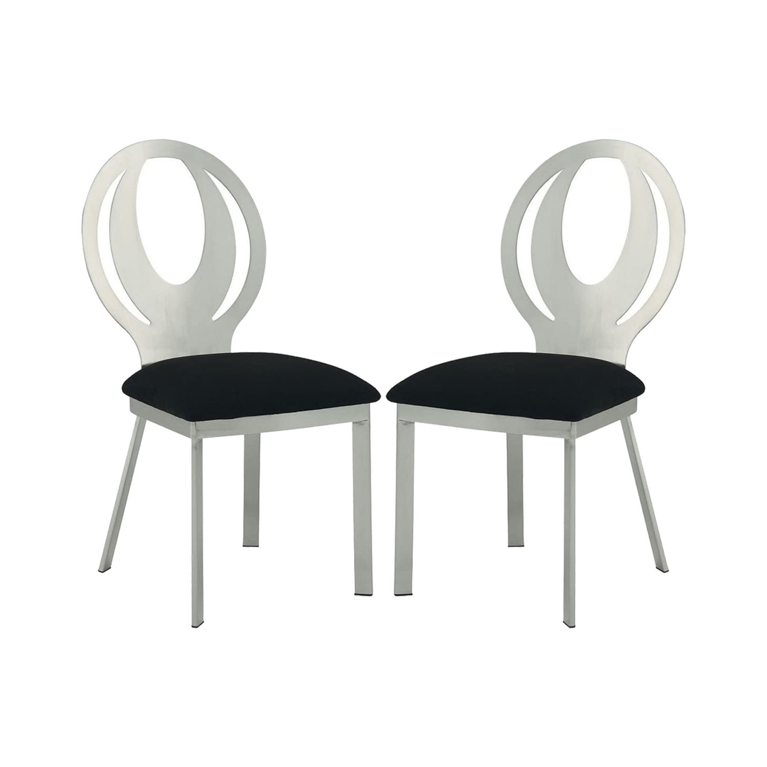 Elevate your dining or seating area with this stylish set of two side chairs, combining contemporary metalwork with comfortable cushioned seating. The oval metal back design and sleek silver and black finish create a modern, eye-catching look that complements a variety of décor styles, while the foam-filled cushions ensure lasting comfort for everyday use.