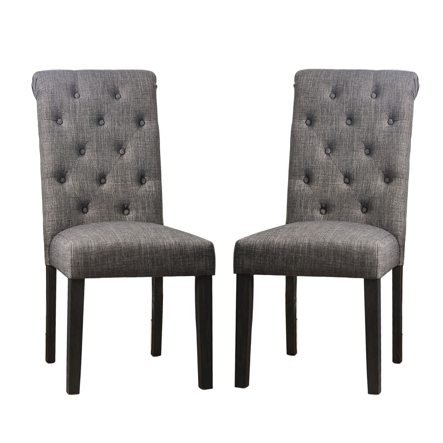 Elevate your dining area with this set of two padded fabric dining chairs, combining vintage-inspired styling with modern comfort. Each chair features button-tufted backrests, plush seats, and a distressed antique black and gray finish that brings a warm, rustic charm to any dining room, breakfast nook, or entertaining space.