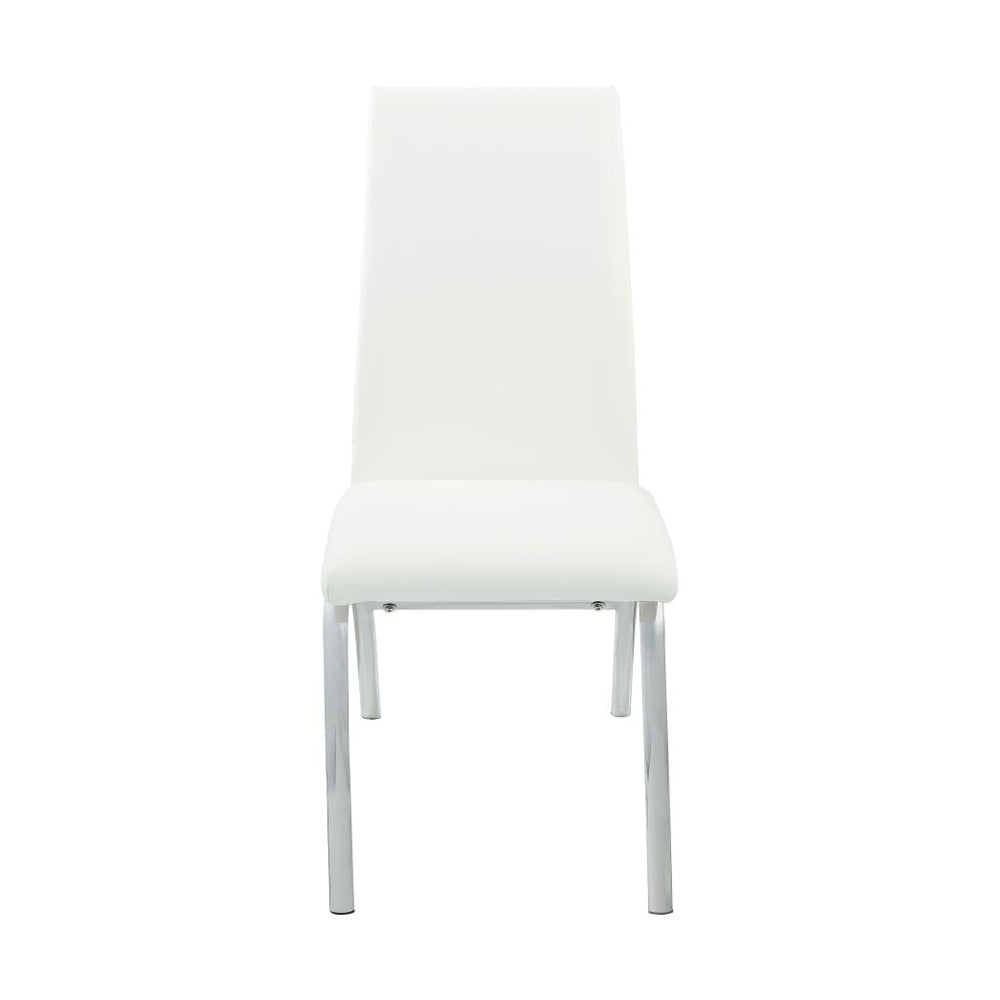 Elevate your dining or seating area with this set of 2 contemporary side chairs, designed to blend modern minimalism with comfortable support. Clean white leatherette upholstery and sculpted seat lines create a polished, upscale look, while slender chrome-finish legs add reflective detail and visual lightness. Perfect for dining rooms, kitchens, home offices, or waiting areas where style and easy maintenance matter.
