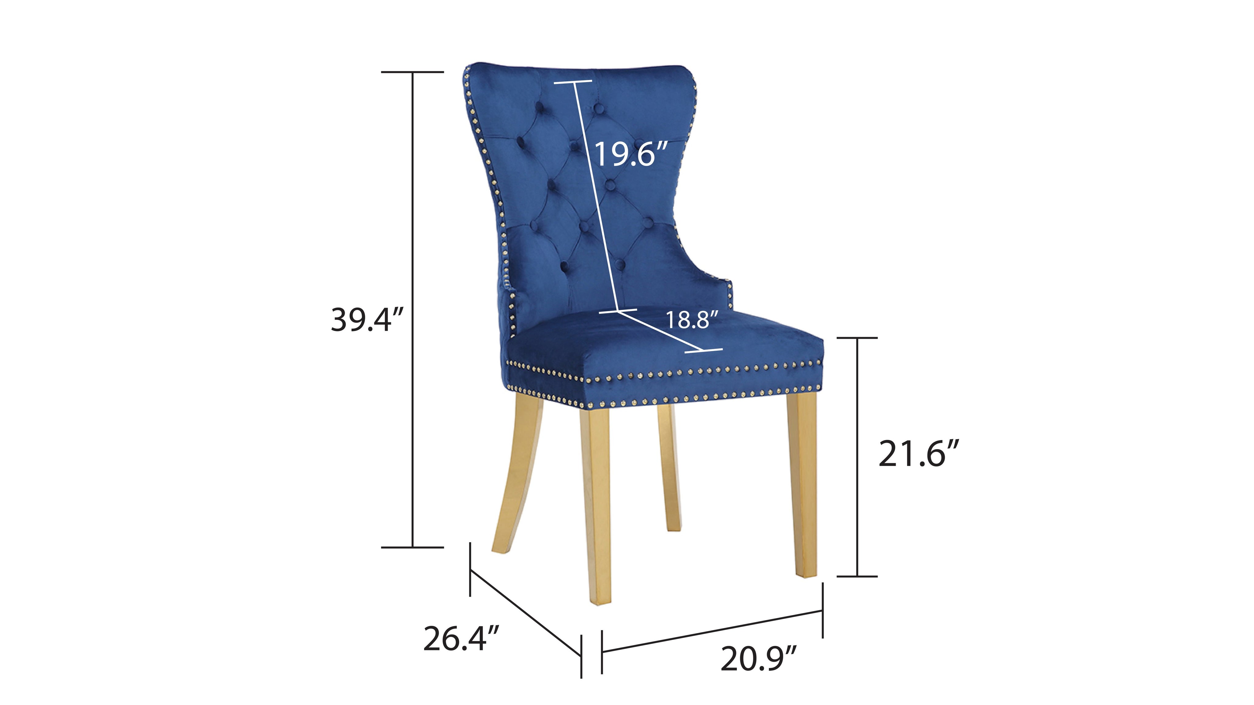 Elevate your dining space with the Simba two-piece set—luxurious navy velvet upholstery, elegant tufting, and striking gold accents combine to create a refined, statement-making look. These chairs balance sumptuous comfort with polished details like a quilted back and a decorative gold lion head ring, making them ideal for formal dinners or stylish everyday use.