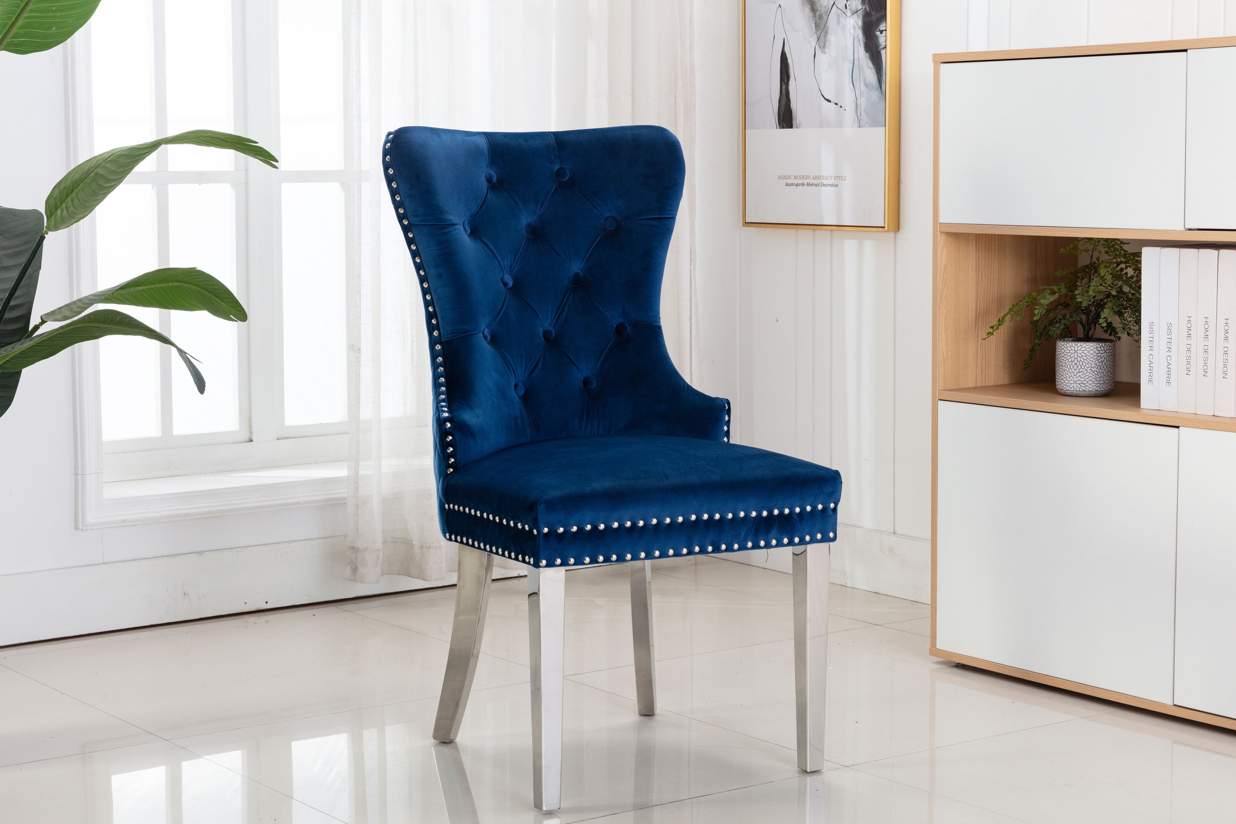 Elevate your dining space with a blend of classic elegance and modern durability. These upholstered dining chairs combine plush velvet comfort with refined details—tufted quilting, a lion head accent ring, and nailhead trim—resting on sleek stainless steel legs for a polished, long-lasting finish.