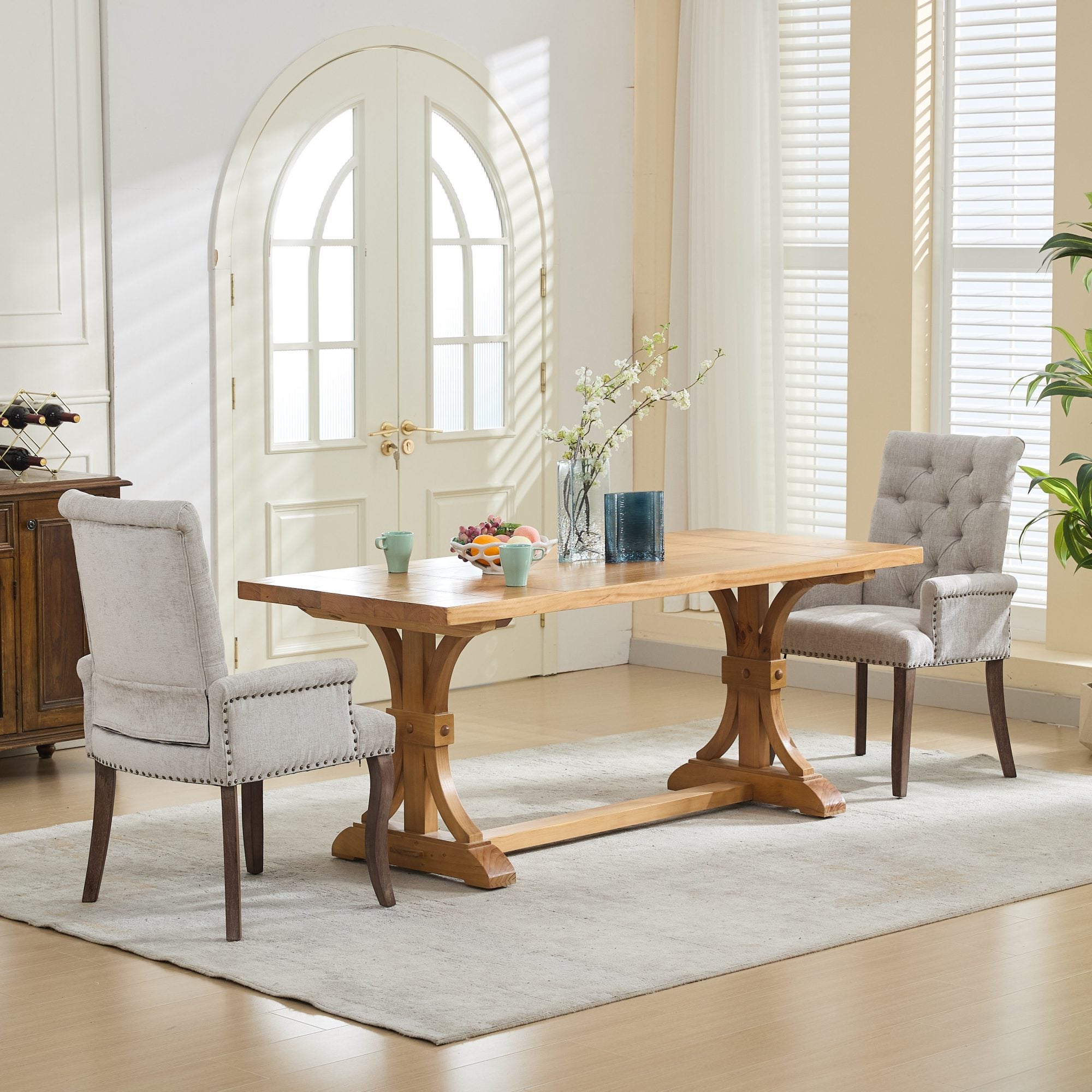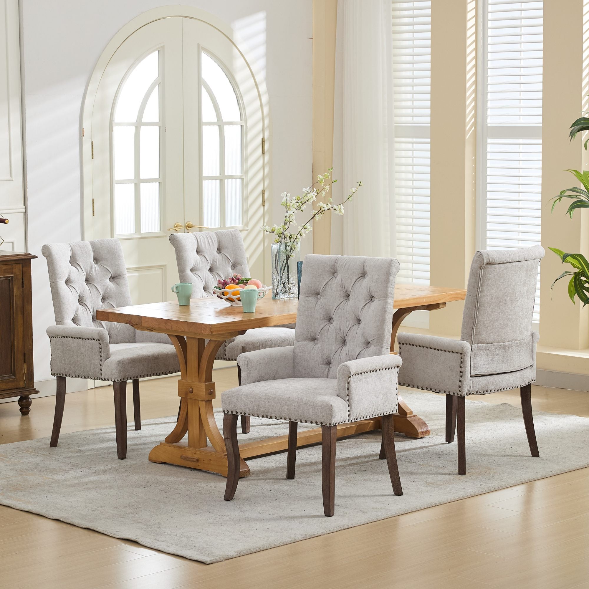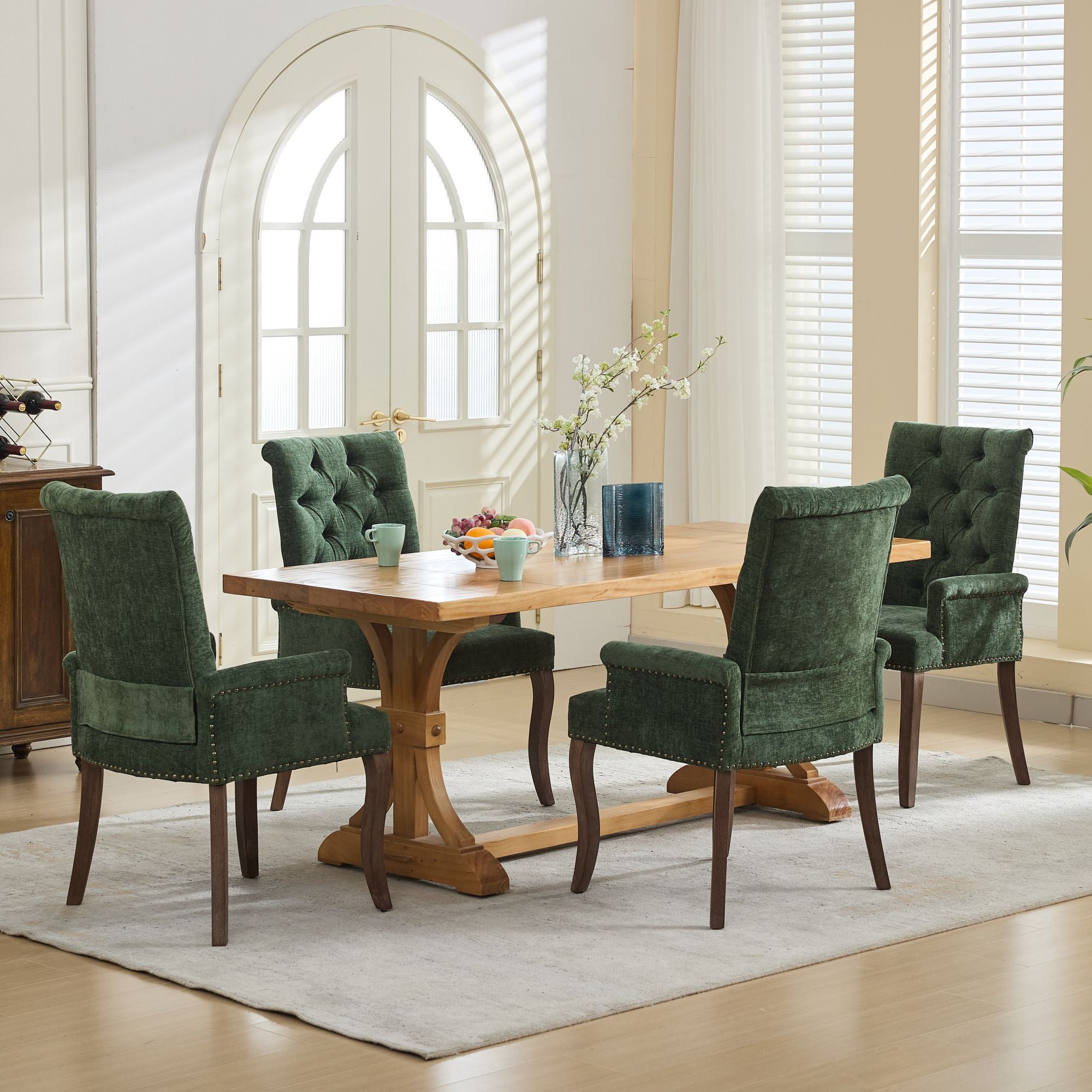 Enhance your dining or living space with this elegant upholstered chenille armchair — a refined blend of comfort, durability, and classic tufted styling. Thoughtfully designed with hand-sanded curved solid wood legs and a plush, skin-friendly chenille cover, it delivers supportive seating for everyday use while elevating your room’s décor.