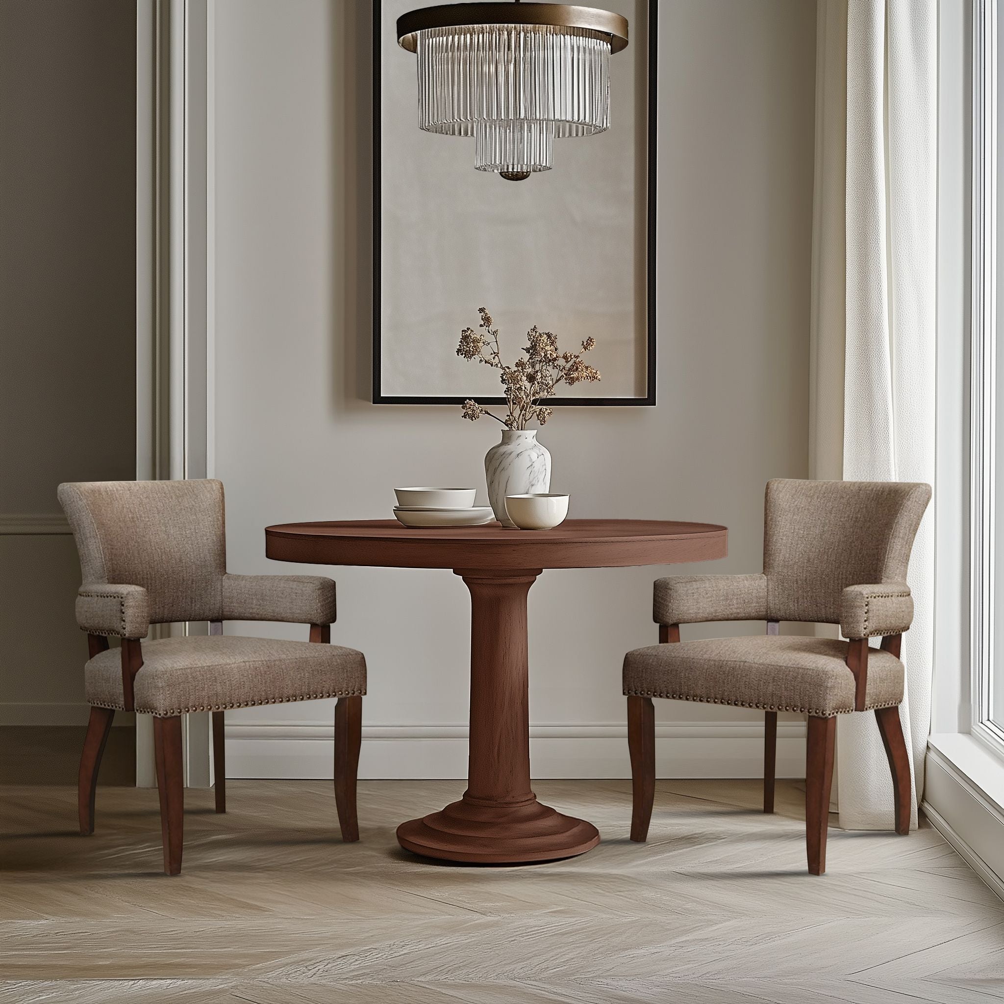 Elevate your dining space with a refined blend of modern tailoring and classic detailing. This arm dining chair features a clean silhouette, nailhead trim, and tailored upholstery for a polished look that complements contemporary and transitional interiors. Perfect for formal dining rooms, breakfast nooks, or as an accent chair in living spaces.