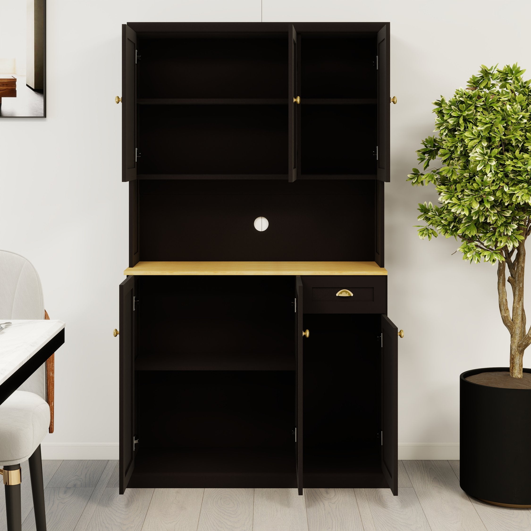 Organize your kitchen with style and efficiency using this tall freestanding pantry hutch—designed to maximize storage while providing a convenient microwave countertop. With a clean white UV-painted finish and a sturdy build, it blends modern looks with practical features for everyday use.