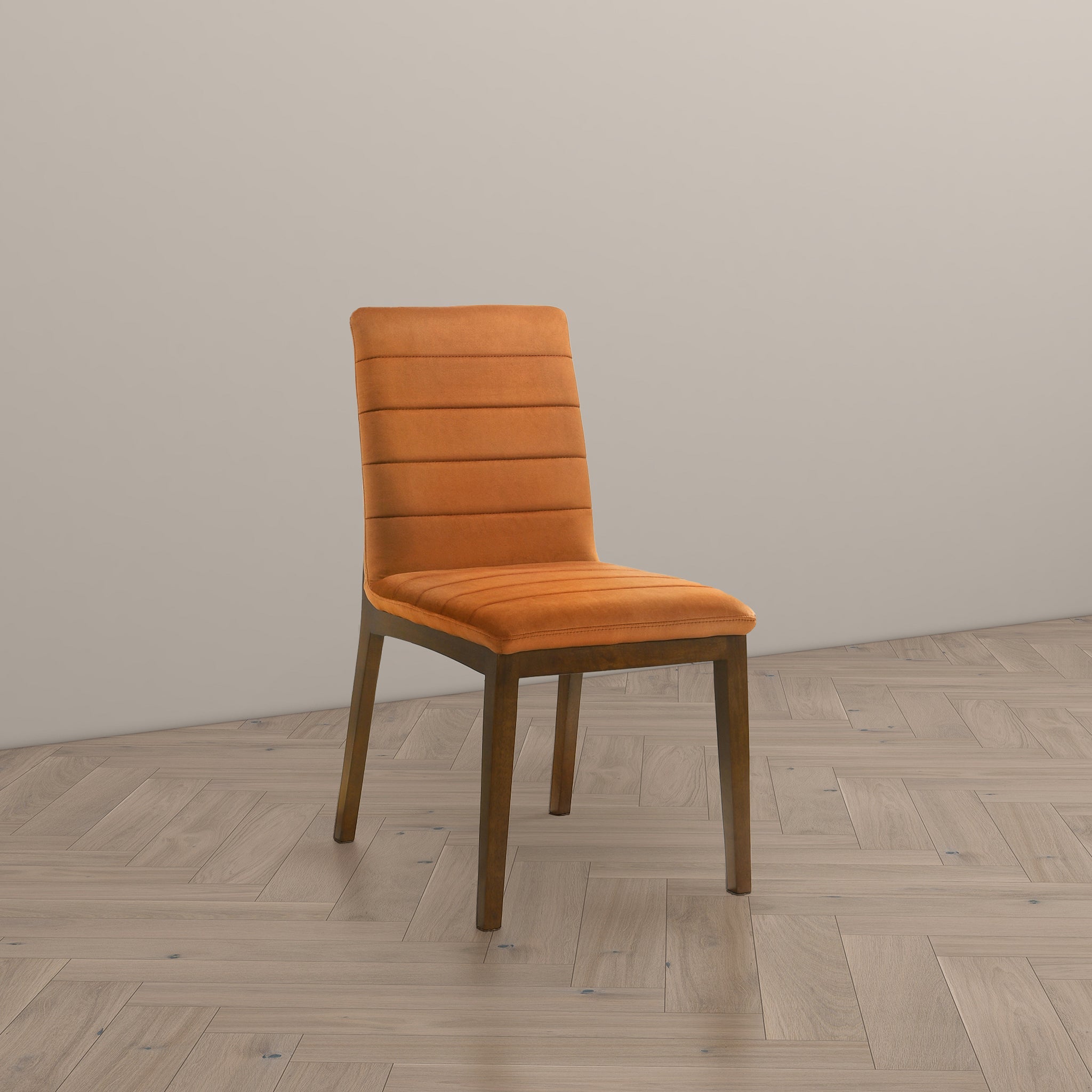 - Crafted with a solid wood walnut-colored base, these dining chairs effortlessly infuse a hint of mid-century modern charm into your home. The set of 2 burnt orange velvet upholstered chairs not only radiate sophistication but also guarantee a snug and enjoyable dining experience.