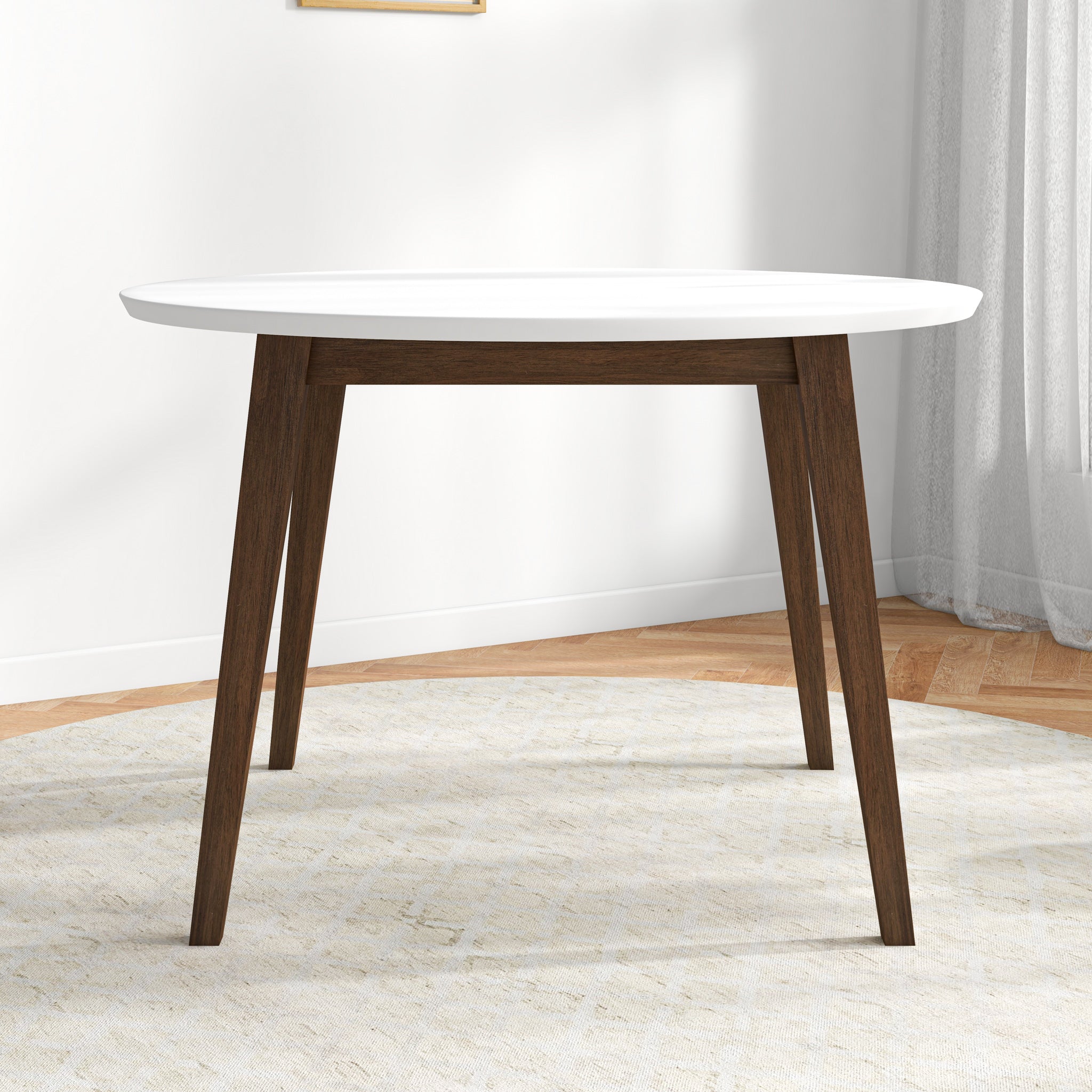 - Enhance your dining room with this versatile mid-century modern round dining table. Crafted from durable, easy-to-clean wood, it comfortably accommodates 4 chairs. The beveled edges ensure safety, making it perfect for small kitchen sets.