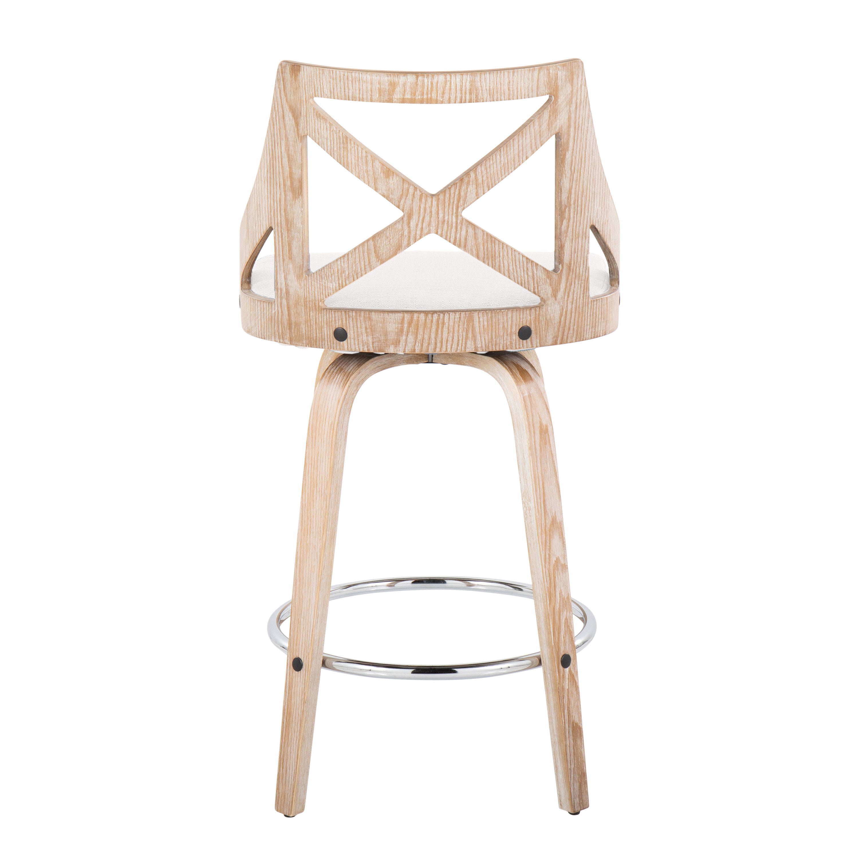 - Spruce up your dining area with the Charlotte Fixed-Height Counter Stool by LumiSource. With elegant styling, the backrest shows off an X-shaped accent. Featuring white wash wood, fabric upholstery, and a swivel seat, the Charlotte Counter Stool beautifully straddles the line between traditional and farmhouse styles.