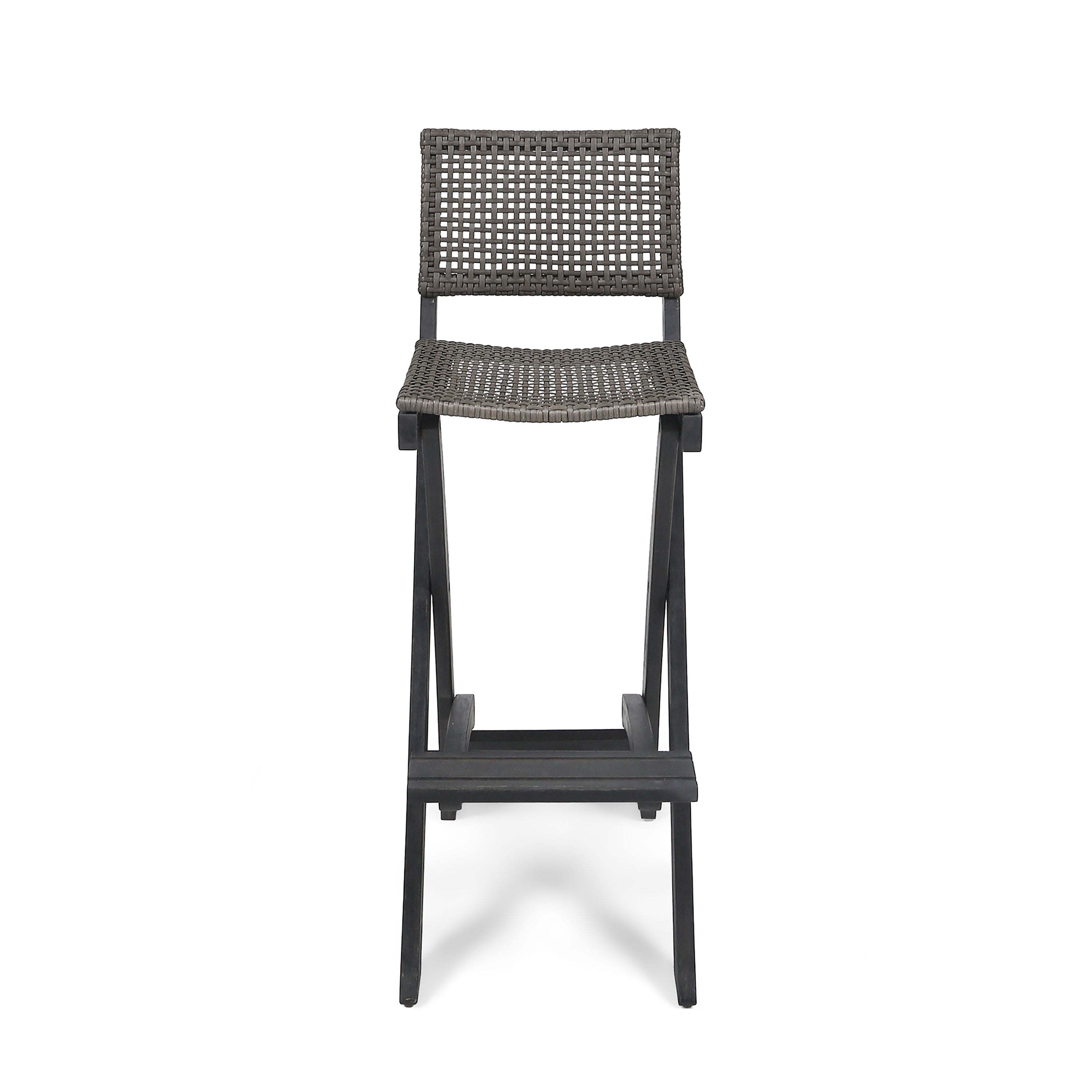 Bring effortless style and practical comfort to your outdoor bar, patio, or balcony with this set of two folding acacia wood barstools. Crafted for durability and easy storage, they combine a warm wood frame with weather-resistant PE rattan seating and a dark grey finish to complement modern and rustic settings alike. Ready to use right out of the box, these barstools offer elevated seating without the hassle of assembly.