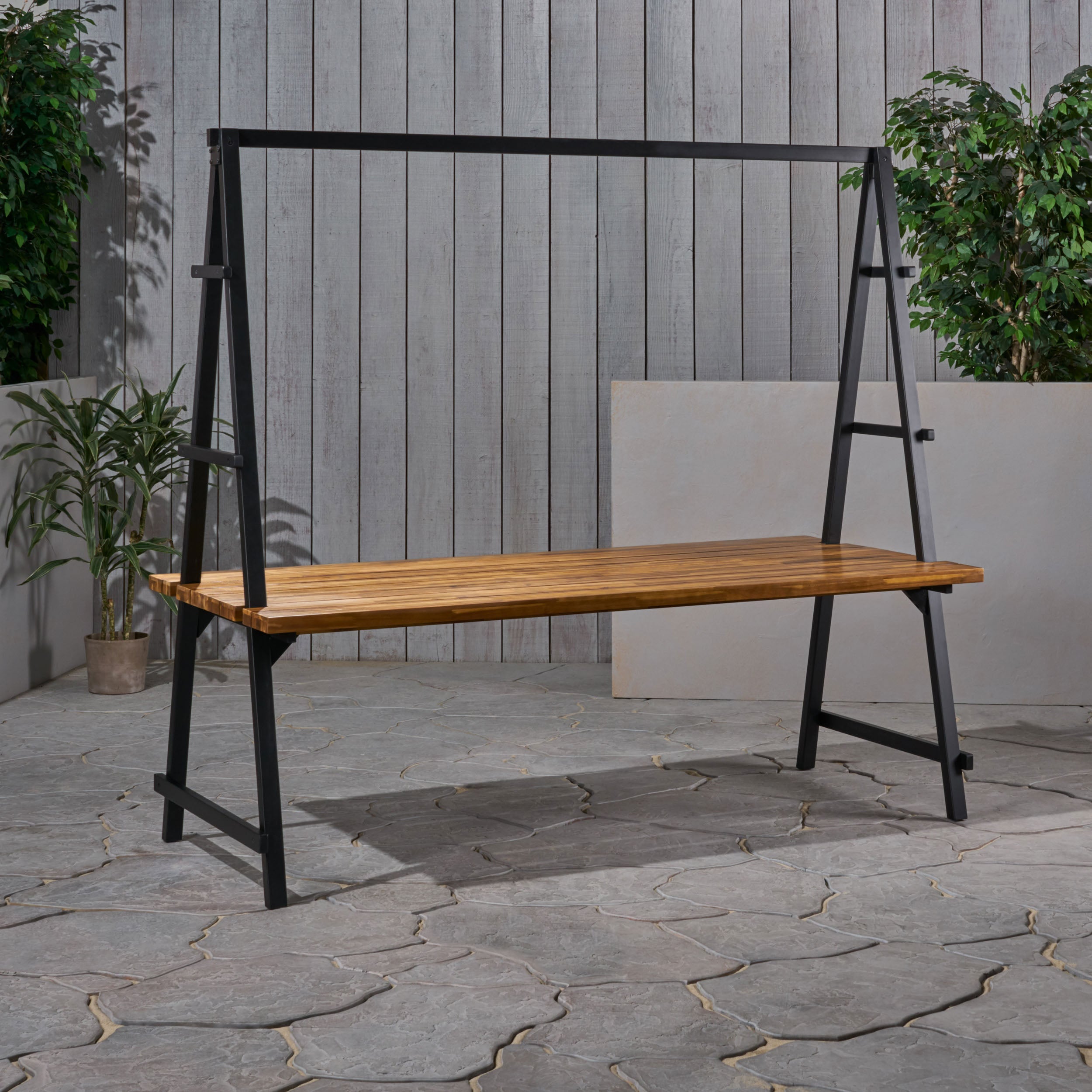 Bring modern rustic charm and practical flair to your outdoor dining area with this striking teak-finish wood and metal table. Crafted from durable acacia hardwood and framed with sturdy metal, it pairs a slatted tabletop and A-frame legs with an integrated overhead bar for hanging potted plants—perfect for entertaining, al fresco meals, or creating a garden-inspired focal point.