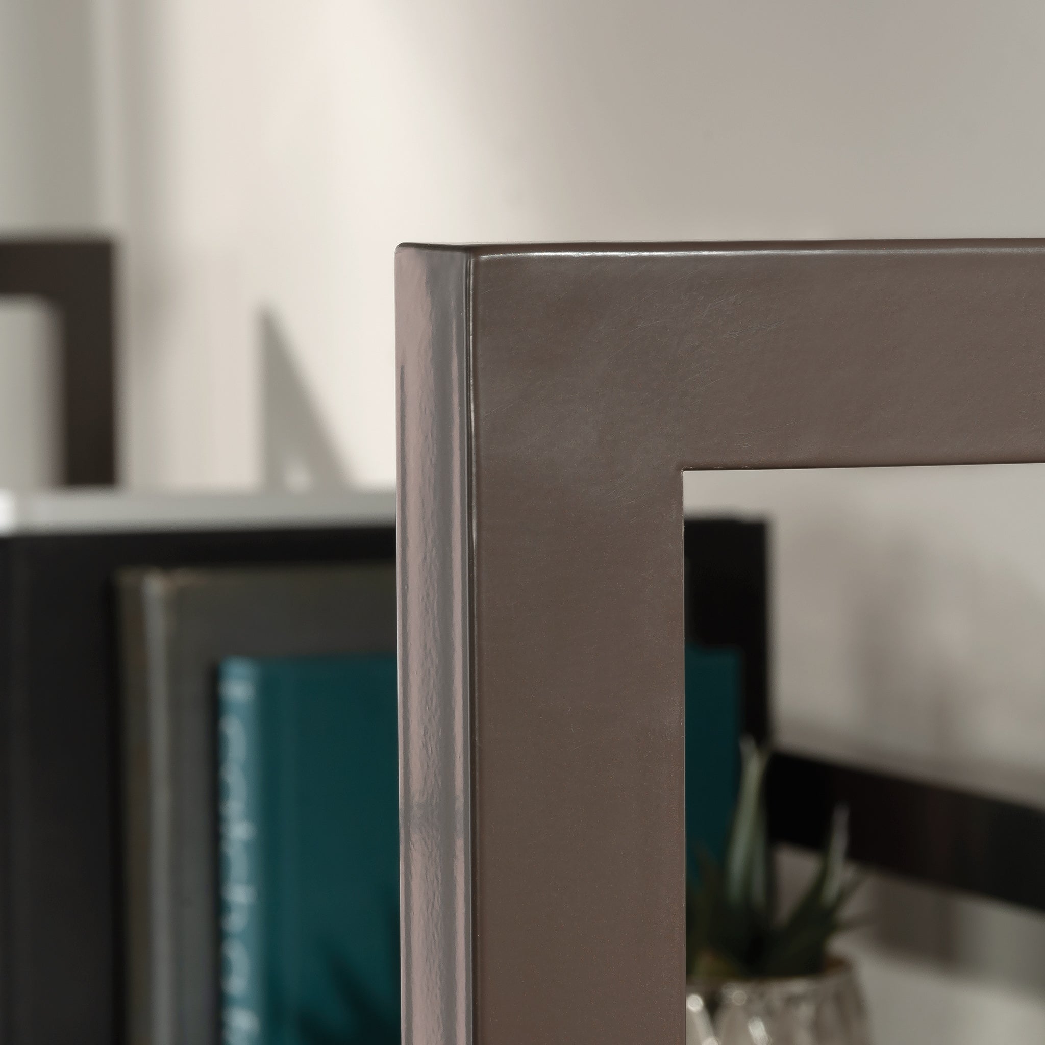- Open shelving for storage and display of books, binders, and more