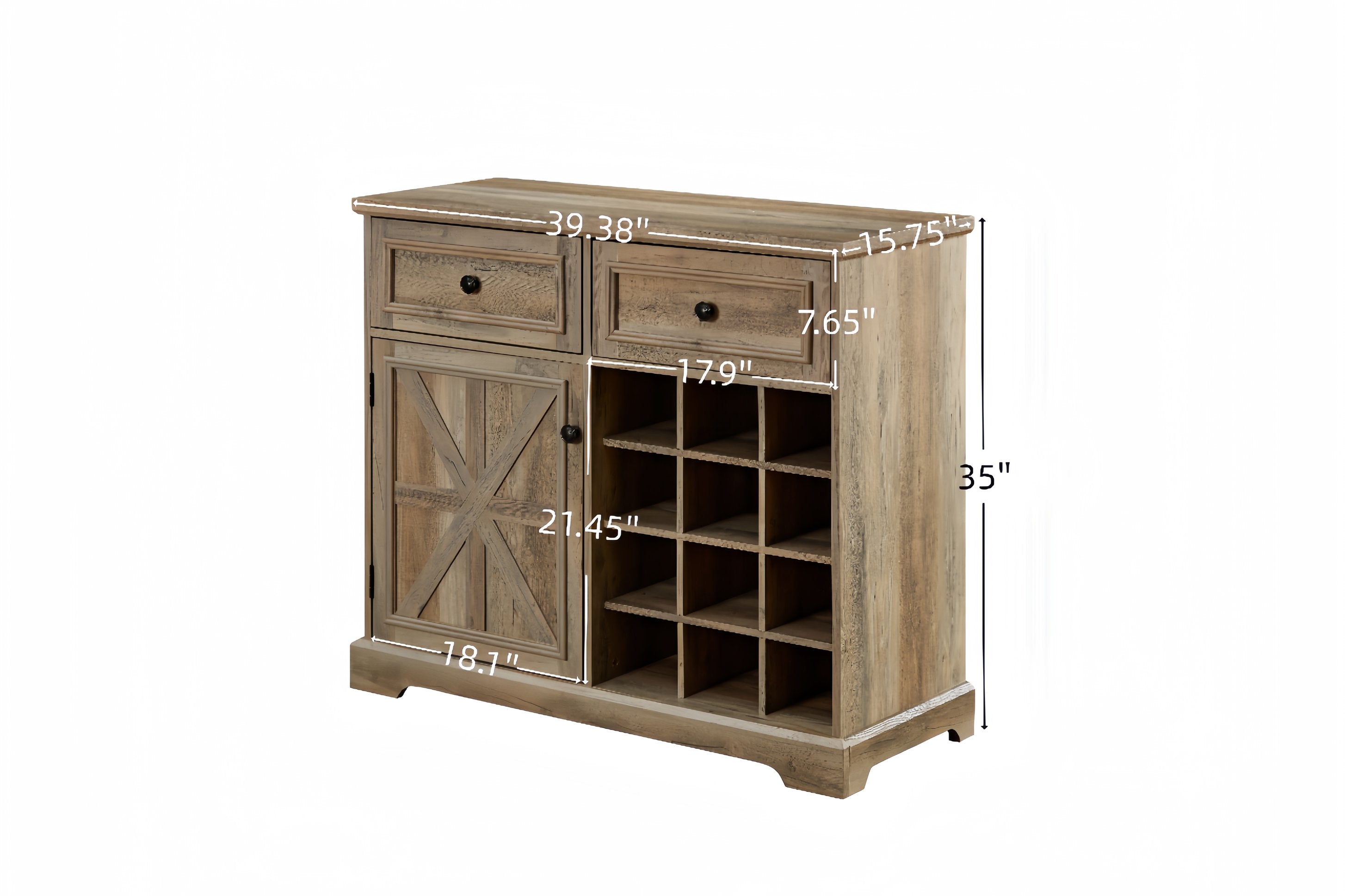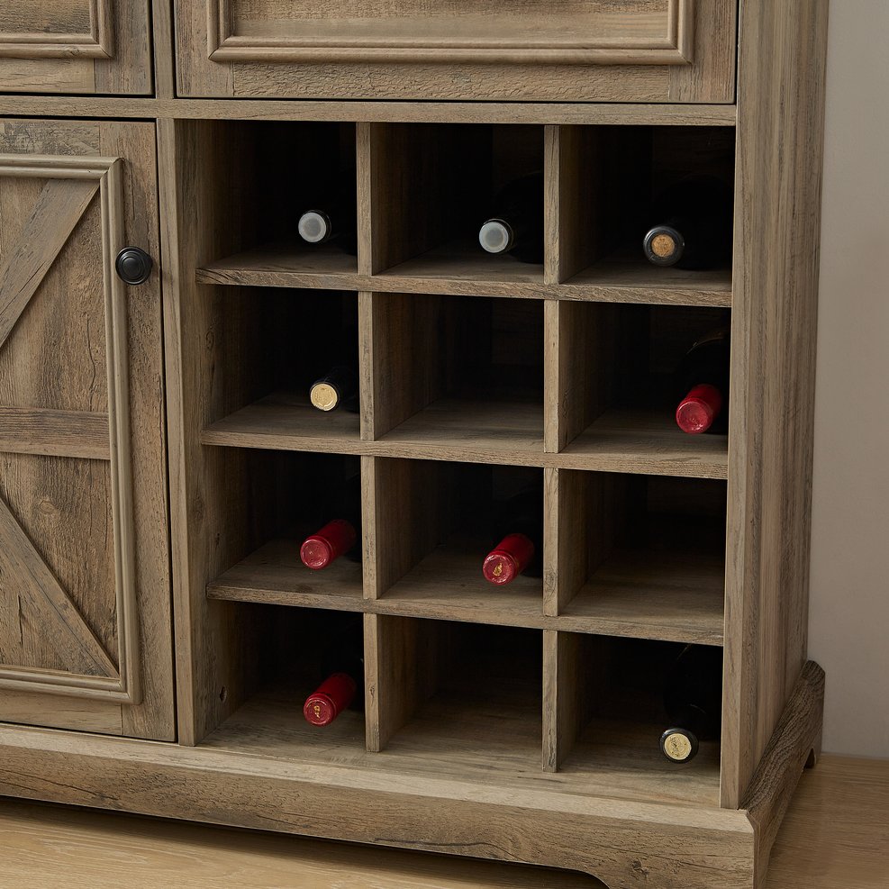 Bring farmhouse charm and practical storage to your kitchen or dining area with this rustic gray-wash buffet cabinet. Designed to combine classic barn-style aesthetics with versatile organization, this sideboard offers roomy drawers, adjustable shelving, and removable wine racks to keep dishes, glassware, and beverages neatly arranged and easily accessible.