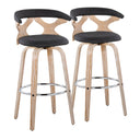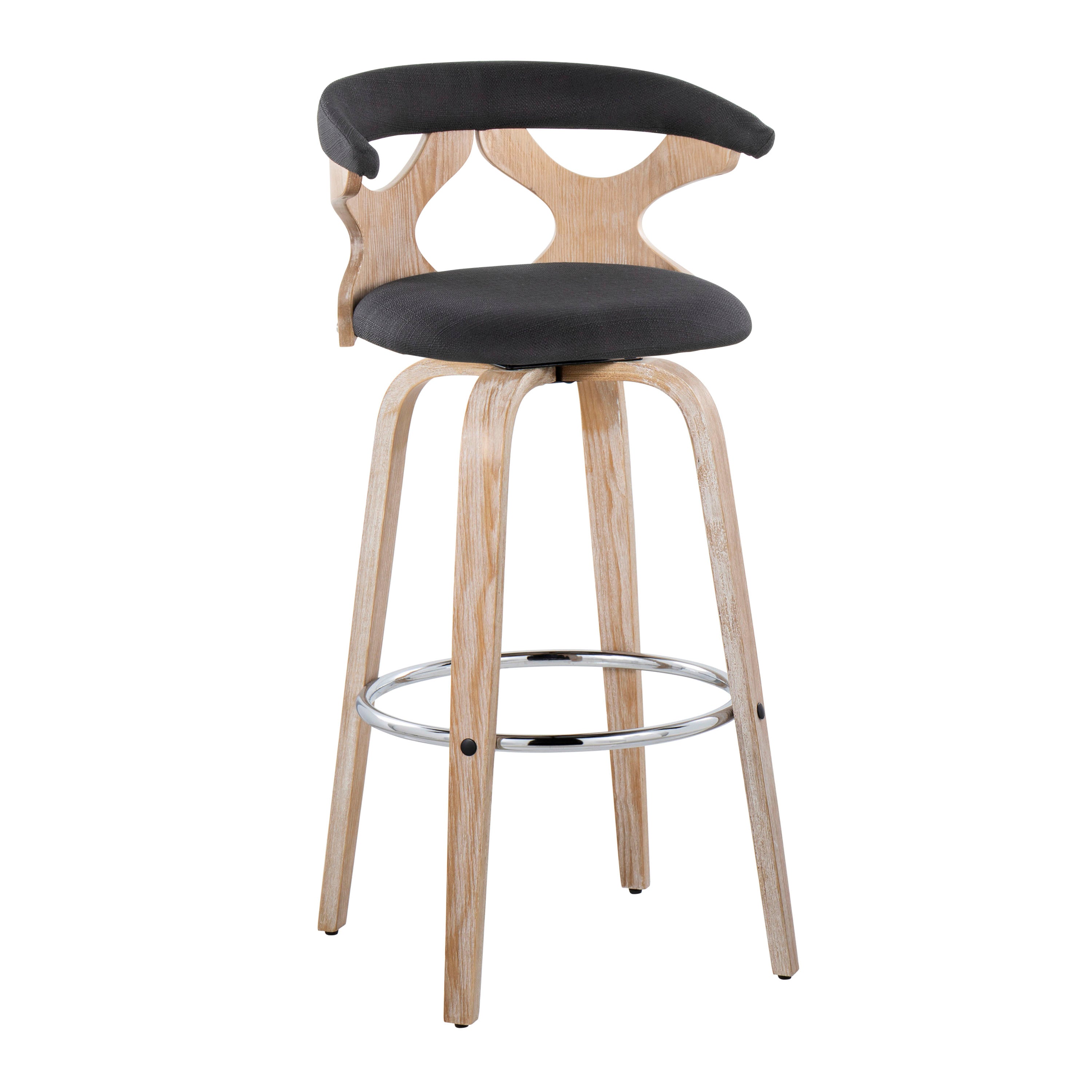 Bring modern flair and comfortable seating to your bar or kitchen island with this set of two Gardenia barstools. Their sculptural cut-out back, plush blue fabric seat, and white-washed wood finish create a fresh, contemporary look while the 360-degree swivel and rounded chrome footrest make them practical for everyday use.