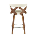 Bring mid-century modern flair and everyday comfort to your kitchen or bar area with this set of two Gardenia counter stools. Featuring a distinctive lattice back, rounded silhouette, and dressed-up woven upholstery, these stools balance sculptural style with practical features like a 360° swivel and sturdy walnut-finish base.