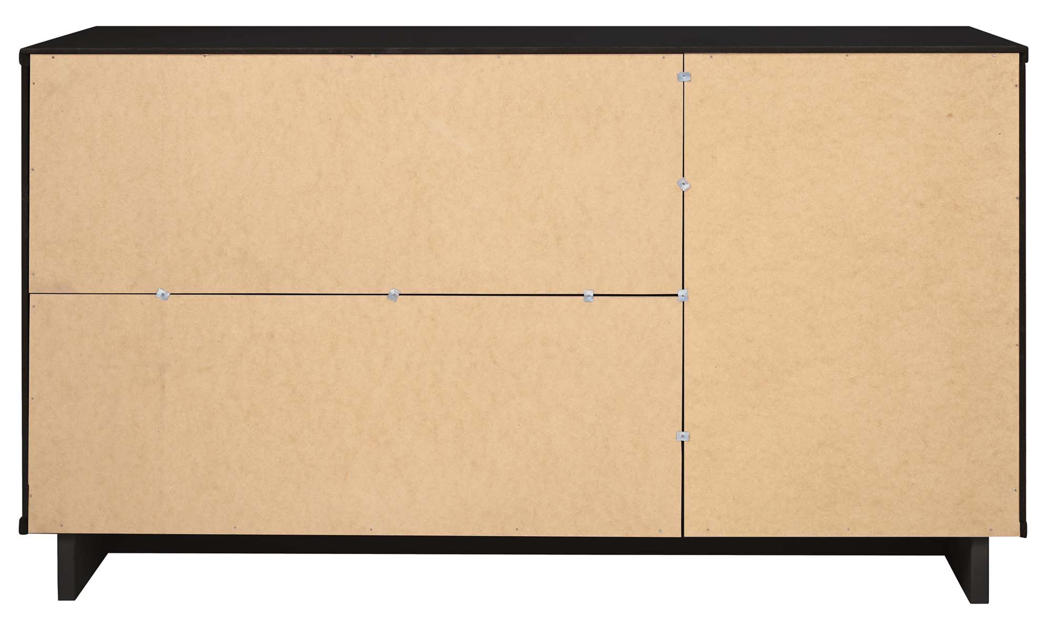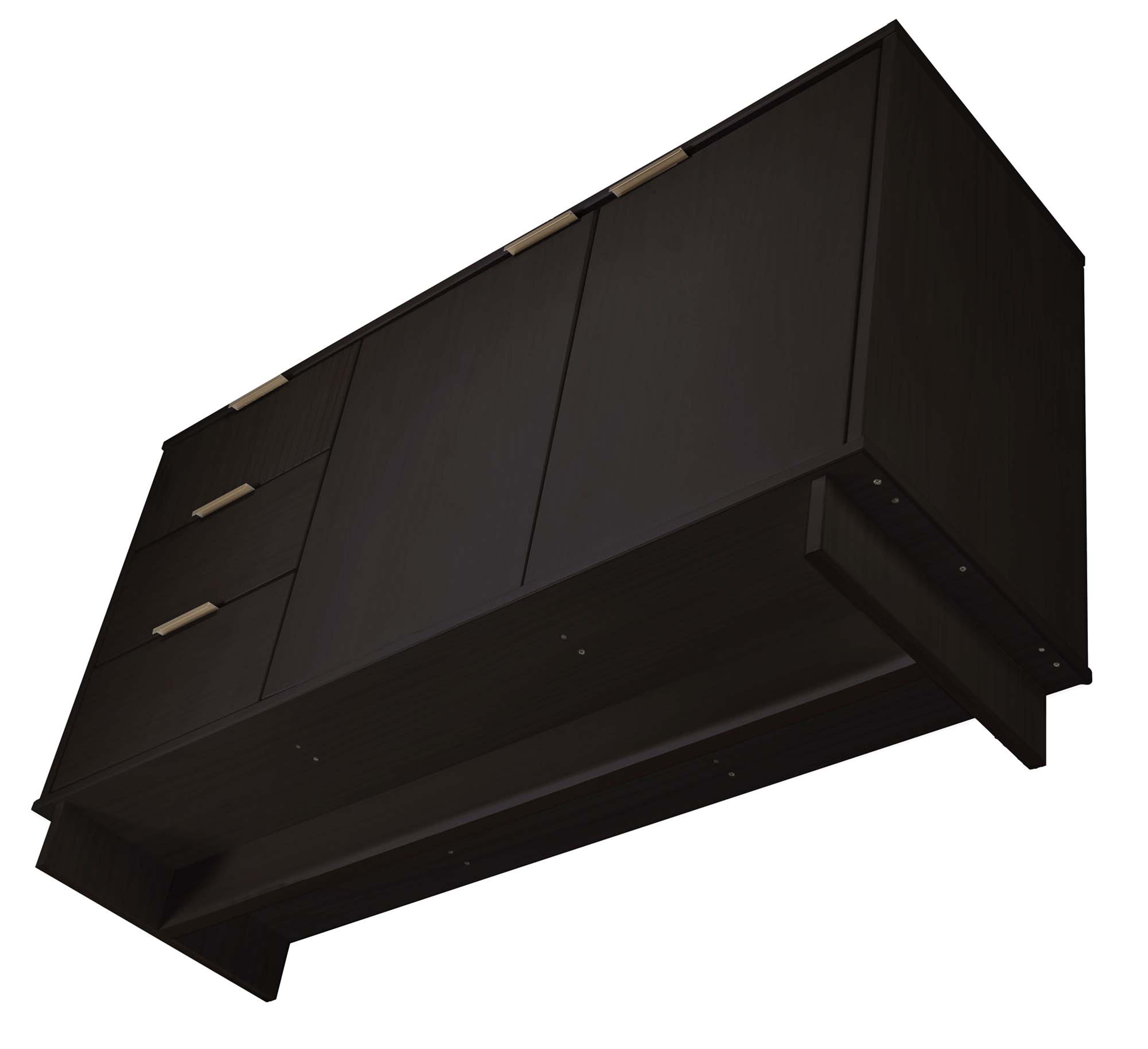 - Hardware & Finish: Horizontal glam drawer handles made of steel with a gold finish add a touch of sophistication against the black finish.