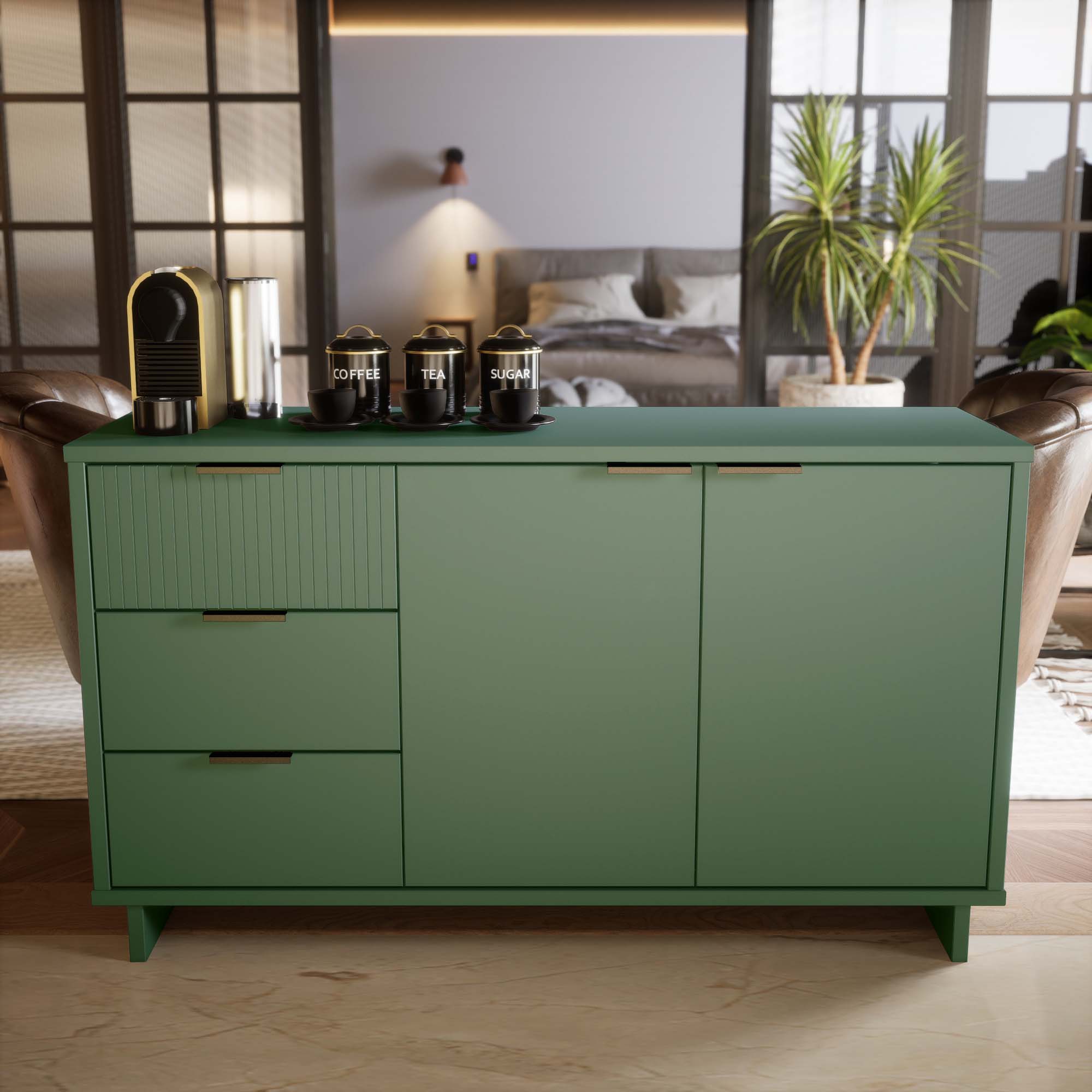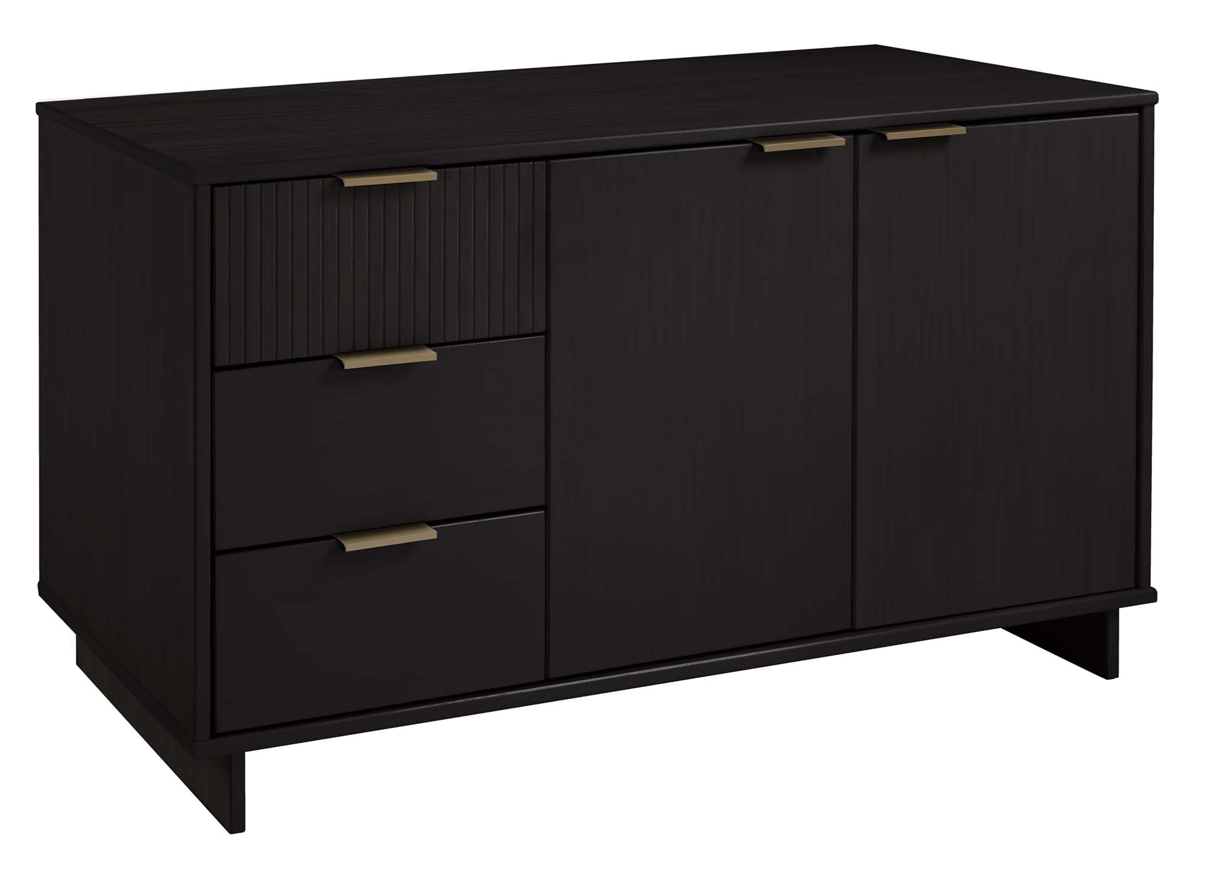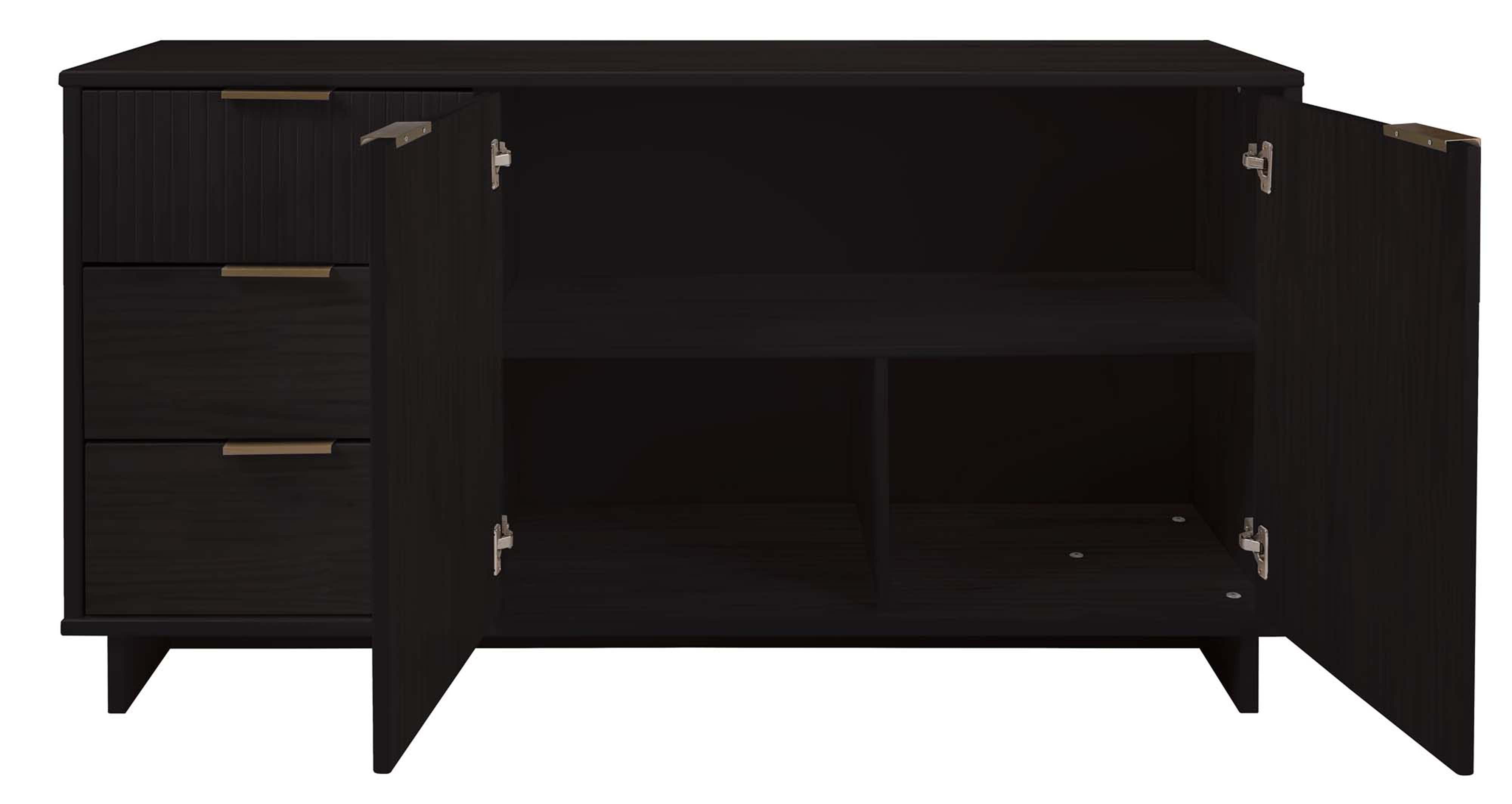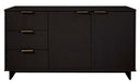 Elevate your living room or media space with the Granville 55" Sideboard in Black — a sleek, contemporary storage solution that blends solid wood craftsmanship with subtle glam details. Designed to serve as a stylish TV stand or elegant buffet, this piece offers ample organized storage, textured drawer fronts, and durable construction to complement modern interiors.