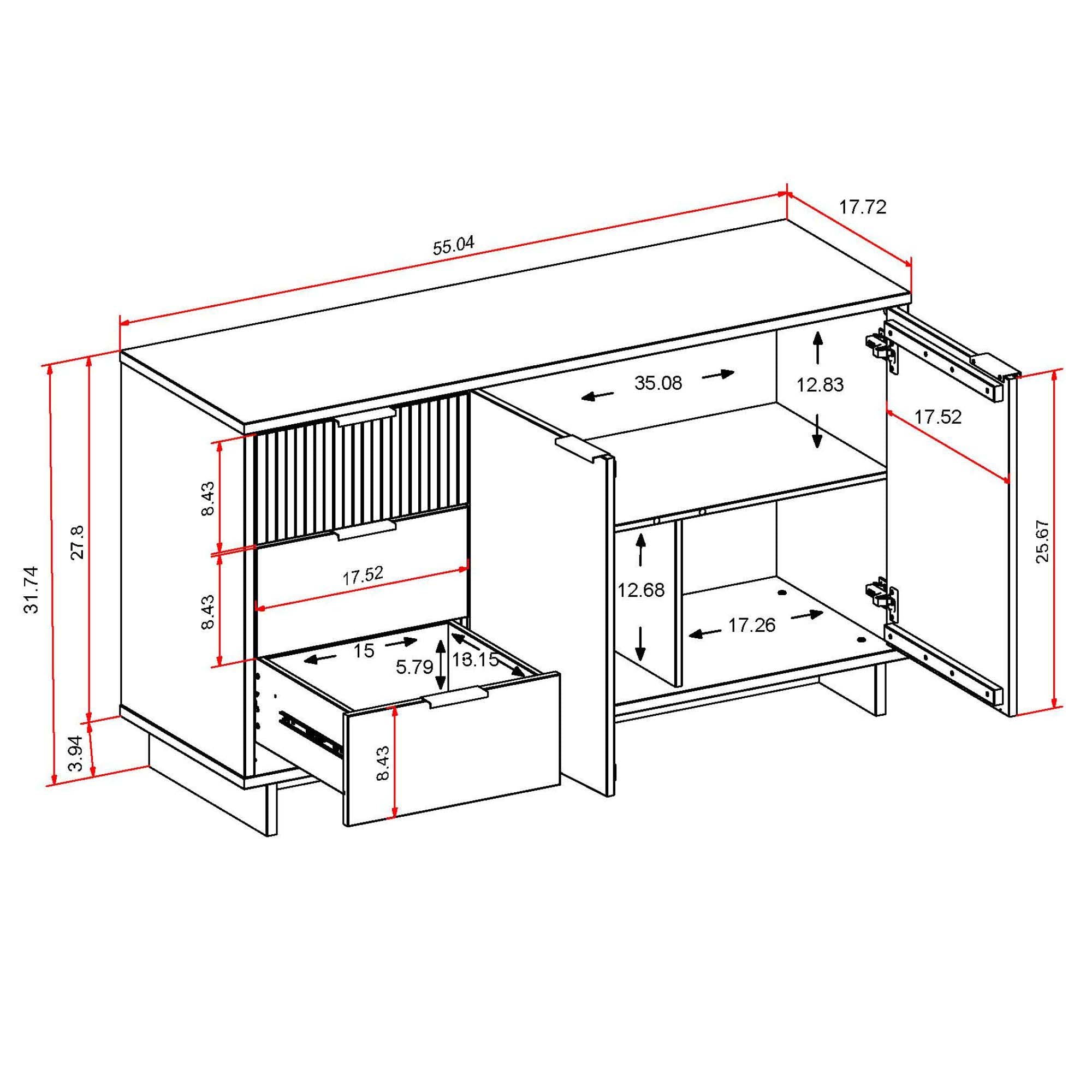 - Upon assembly, Sideboard Dimensions Measure: 55.04 in. Length, 31.73 in. Height, 17.72 in. Depth.