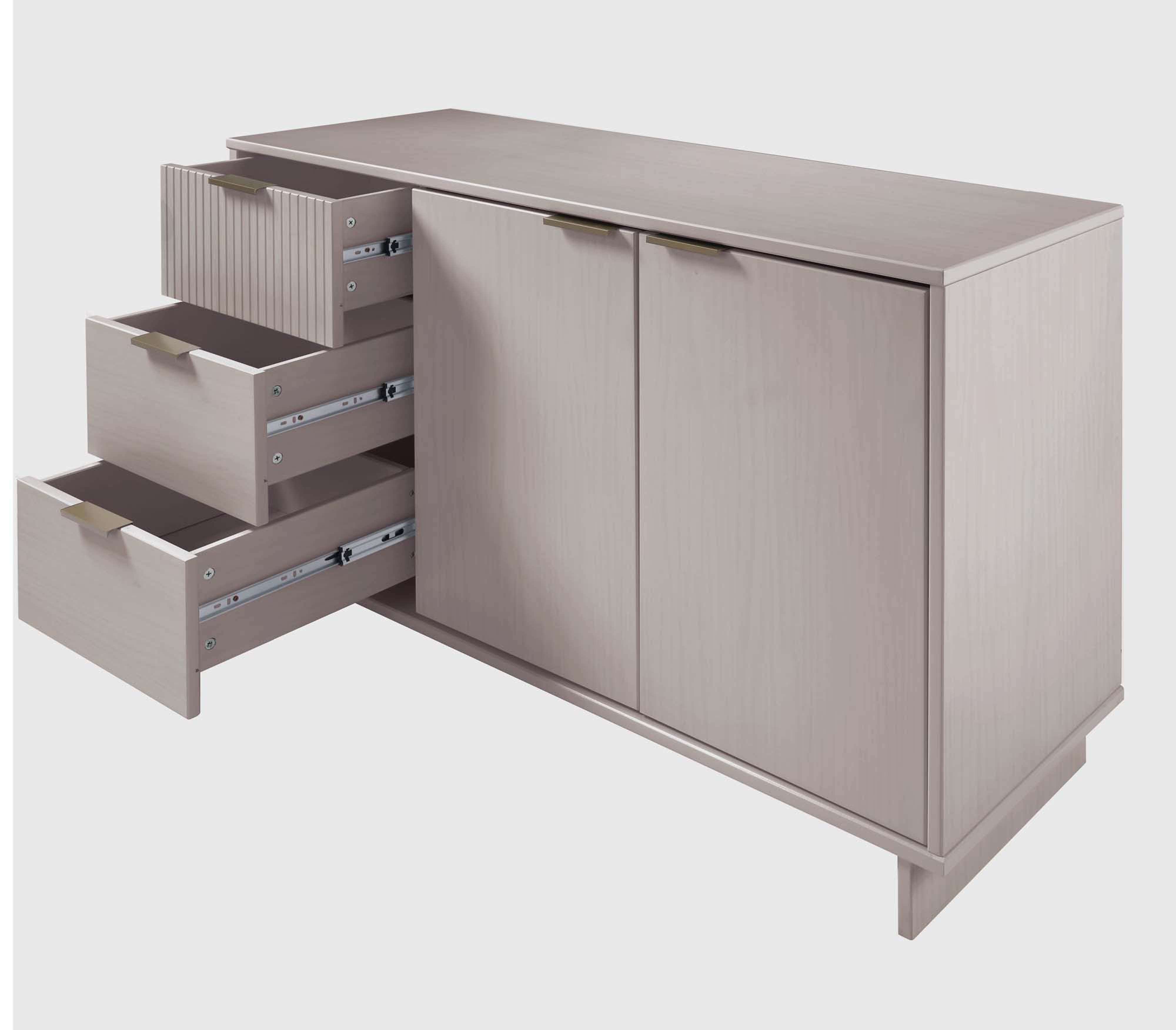 - Includes 3 Full Extension Drawers with Top Drawer Designed in Vertical Textured Ribbed Lines Made from Solid Wood and 3 Concealed Shelves.