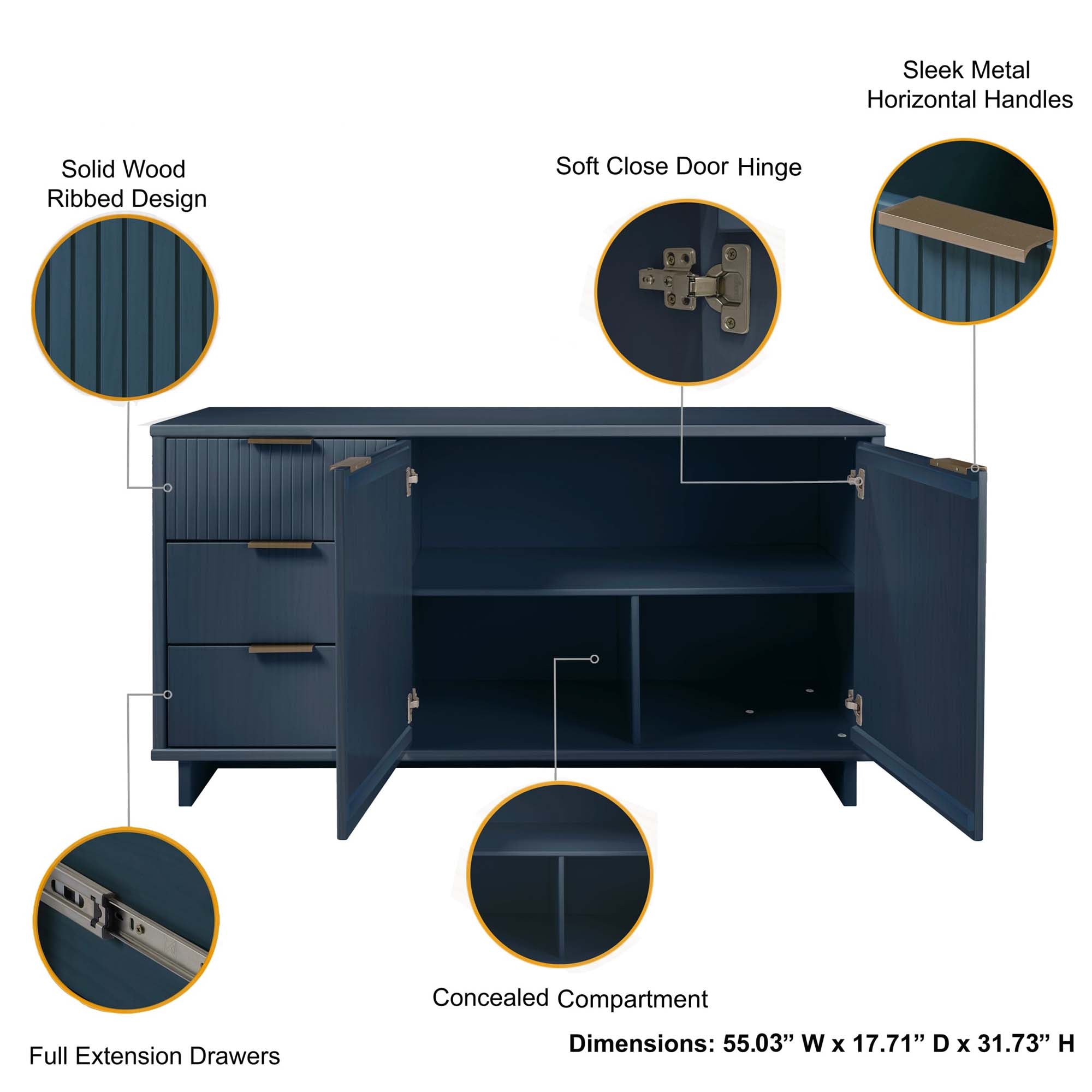 - Key Dimensions: 55.04" L x 17.72" D x 31.73" H (also listed as Product Dimensions: 31.57" L x 6.29" W x 21.29" H) — primary sideboard dimensions are 55.04 in. length, 31.73 in. height, and 17.72 in. depth.