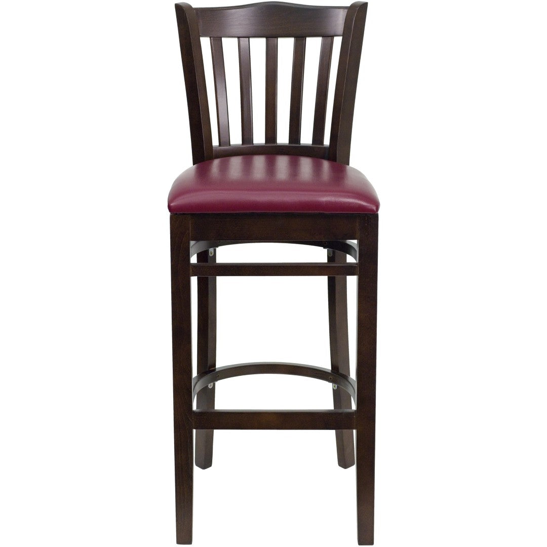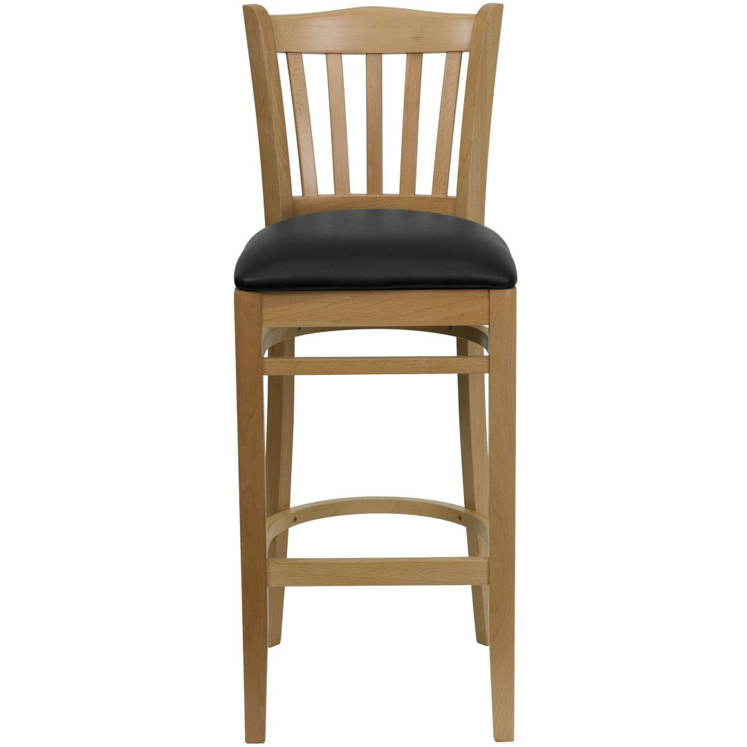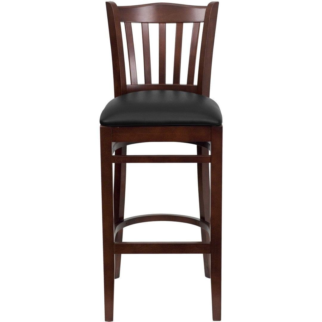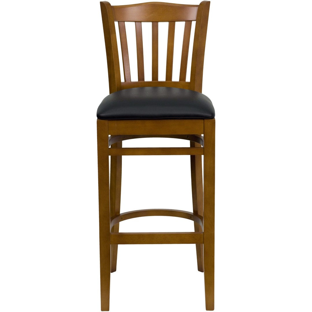 Welcome guests with a blend of classic styling and commercial-grade durability. This cherry wood vertical slat back barstool pairs a warm, inviting finish with a thickly padded black vinyl seat to deliver both comfort and long-lasting performance for restaurants, bars, lounges, and high-traffic homes.