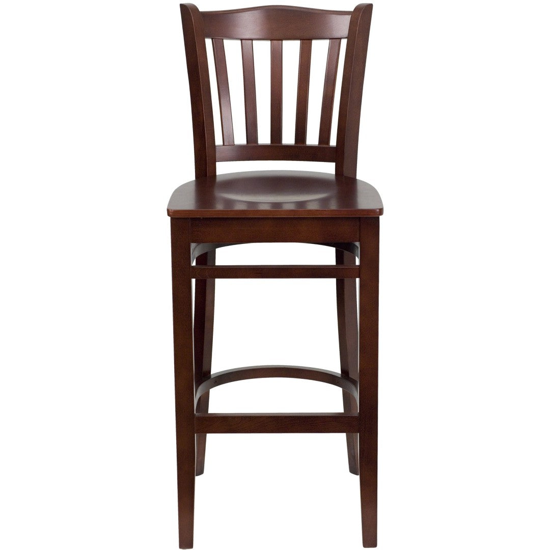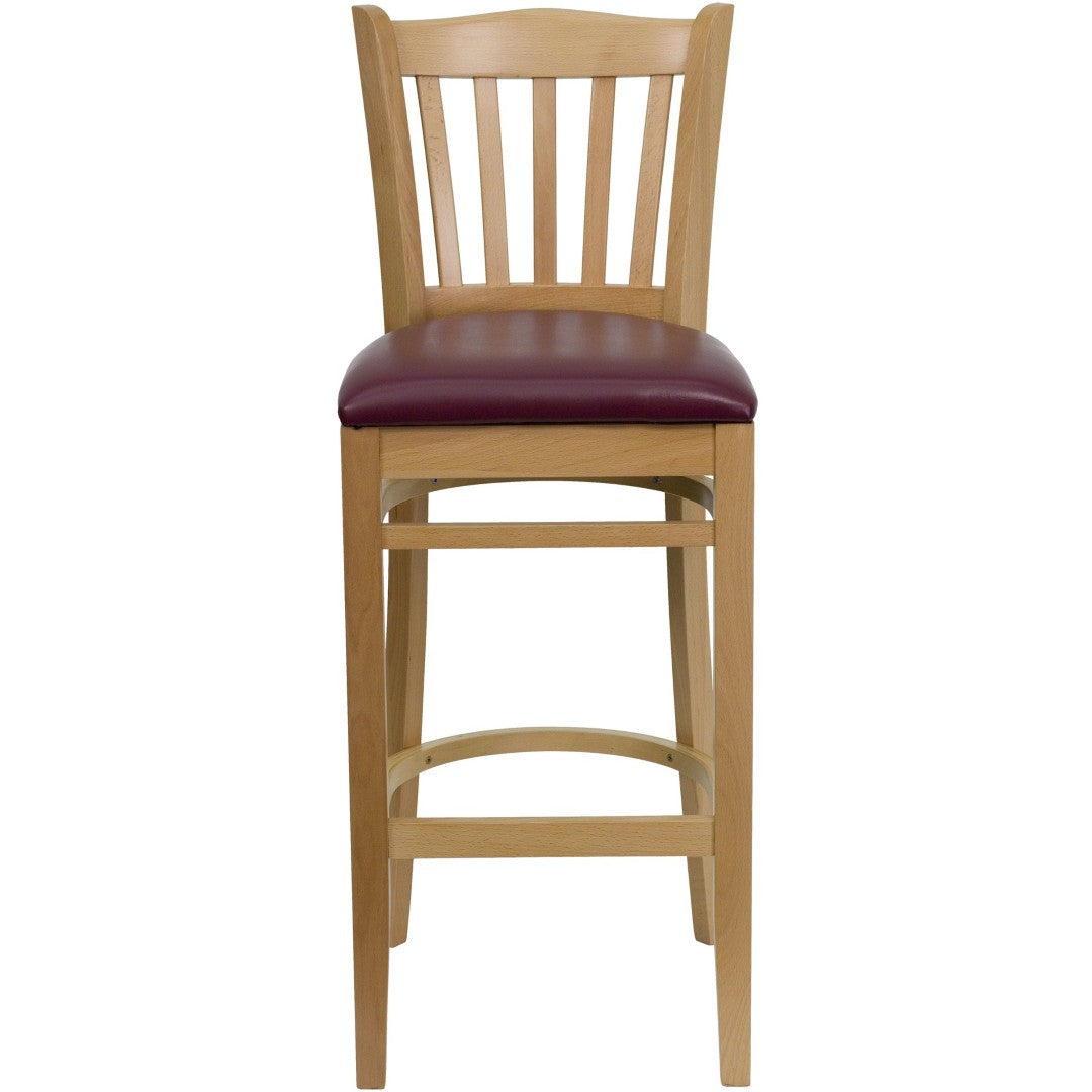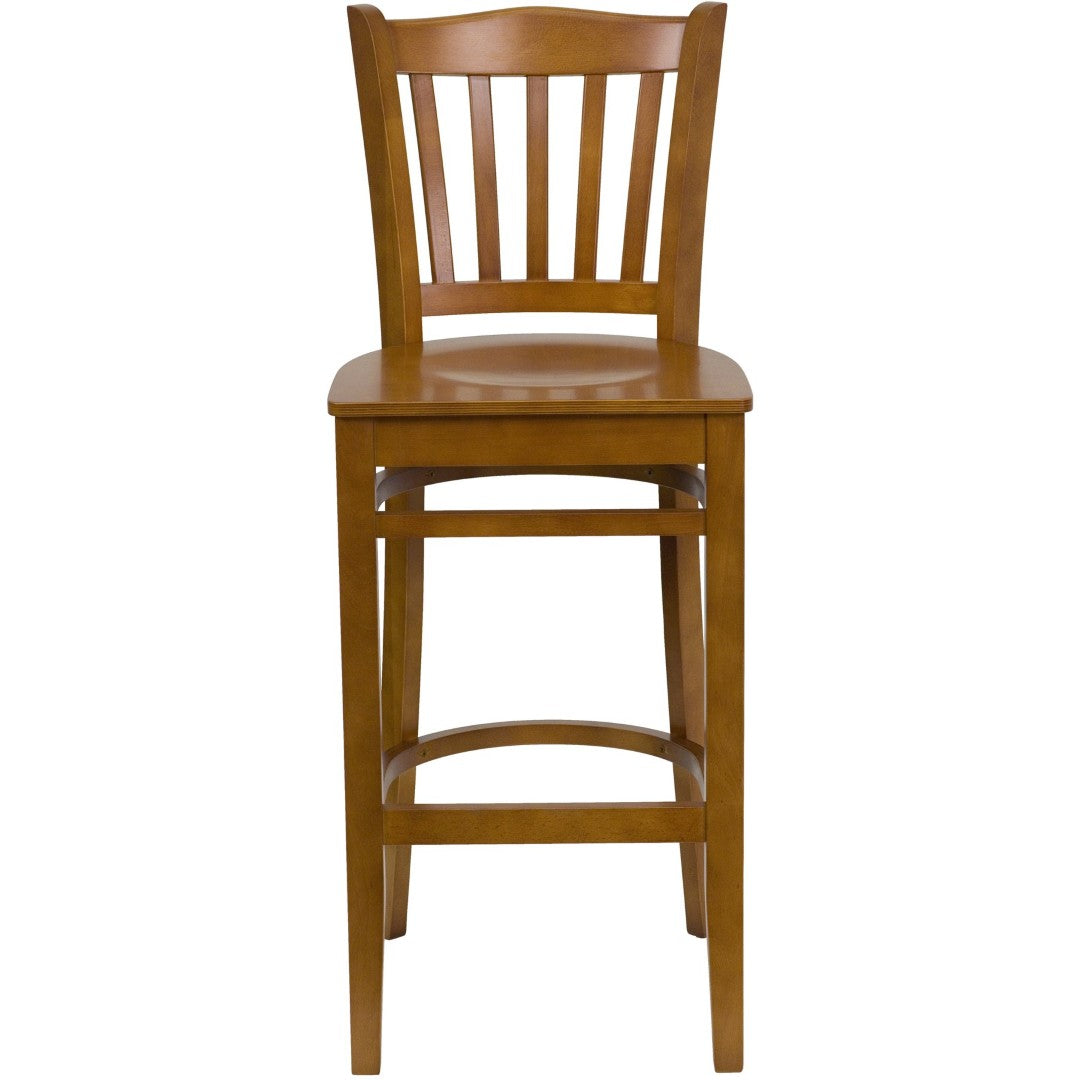 Welcome guests with a blend of classic styling and commercial-grade durability. This cherry wood vertical slat back barstool pairs a warm, inviting finish with a thickly padded black vinyl seat to deliver both comfort and long-lasting performance for restaurants, bars, lounges, and high-traffic homes.