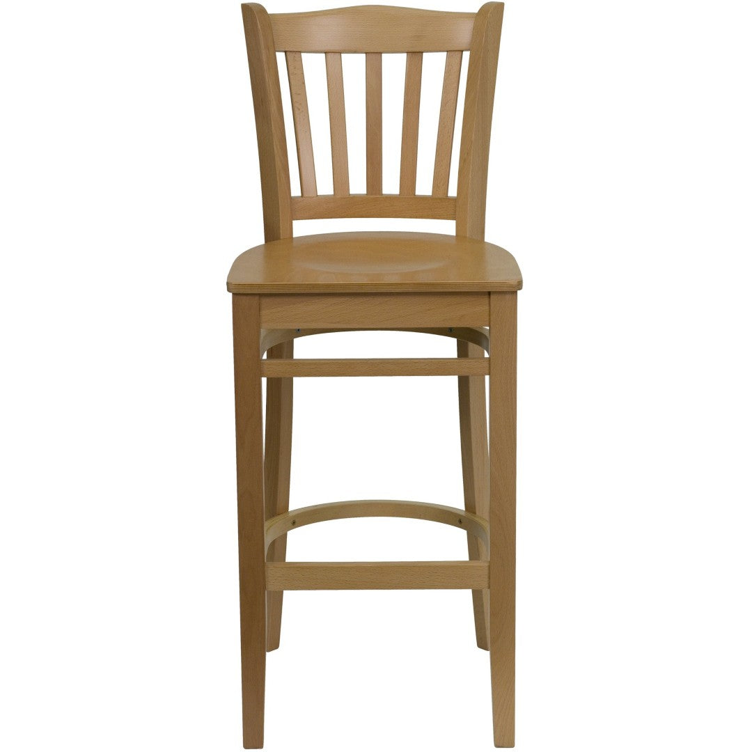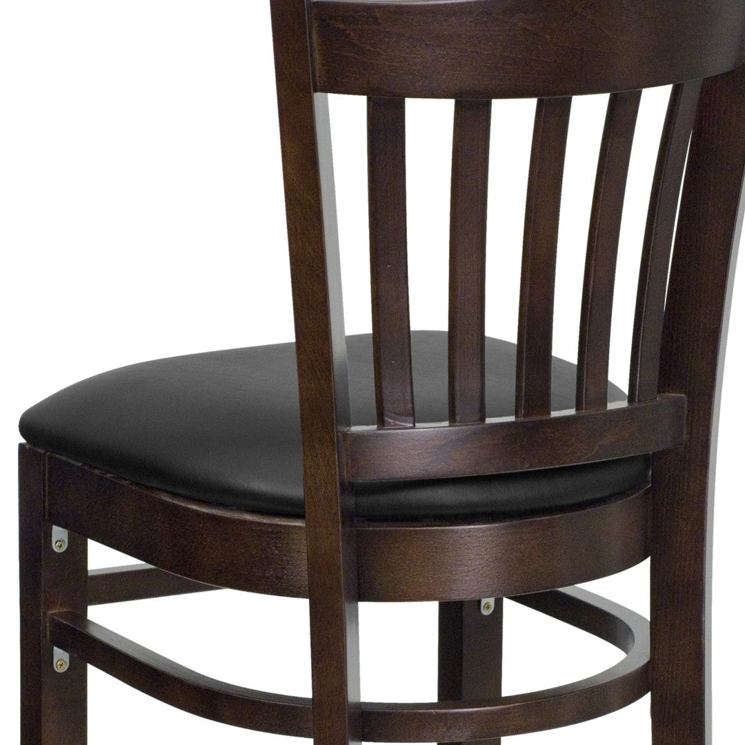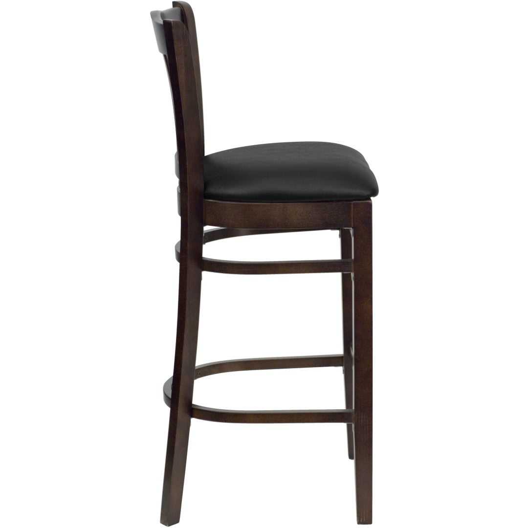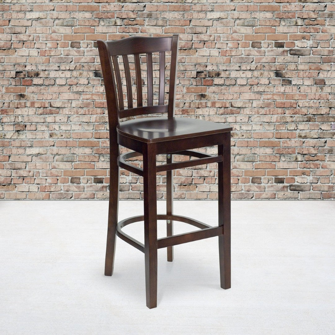 Welcome guests with a blend of classic styling and commercial-grade durability. This cherry wood vertical slat back barstool pairs a warm, inviting finish with a thickly padded black vinyl seat to deliver both comfort and long-lasting performance for restaurants, bars, lounges, and high-traffic homes.