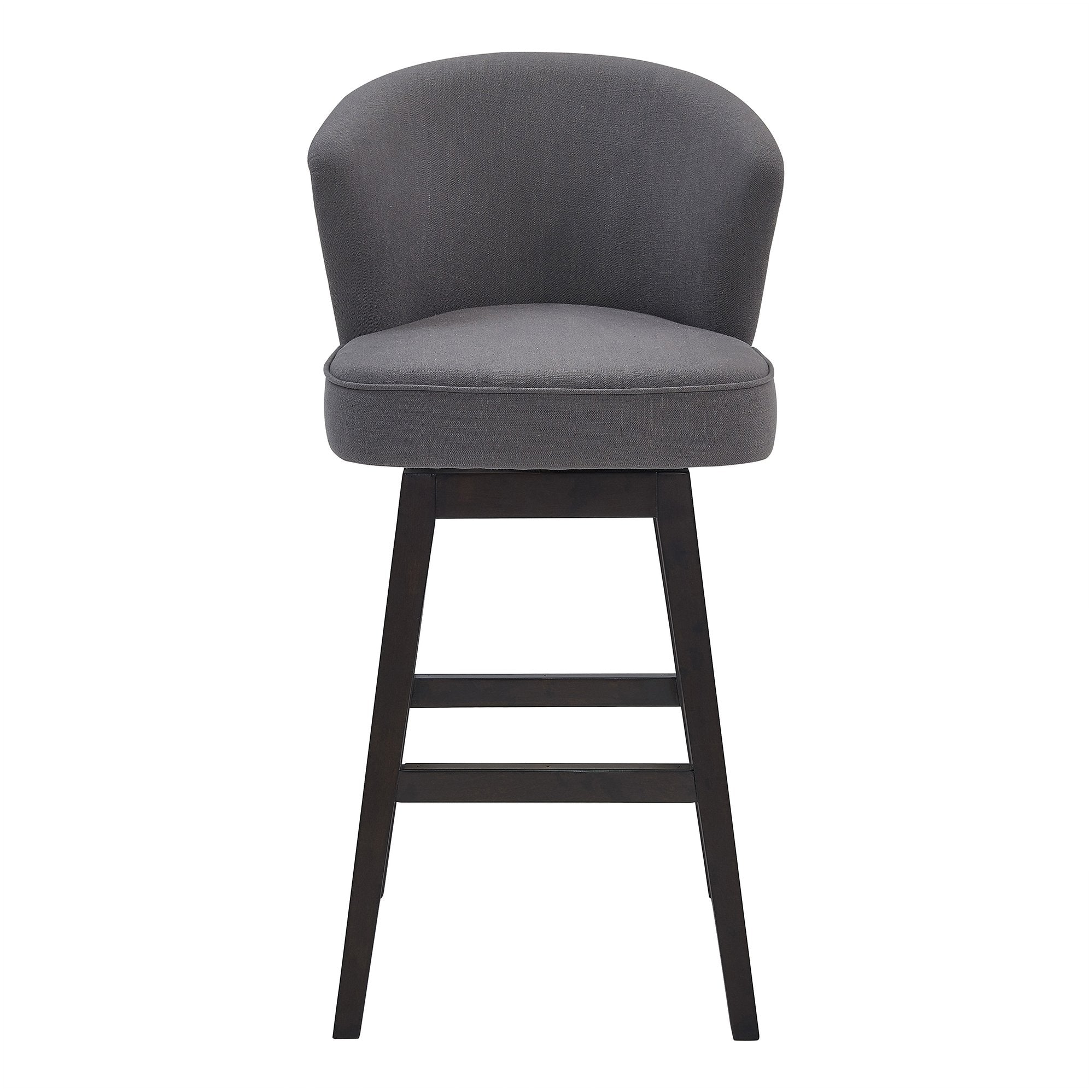 Bring modern comfort and versatile functionality to your kitchen, home bar, or dining nook with this stylish swivel bar stool. Upholstered in soft gray fabric over a supportive cushioned seat and finished with rich espresso wood legs, it combines contemporary design with practical features for everyday use and entertaining.