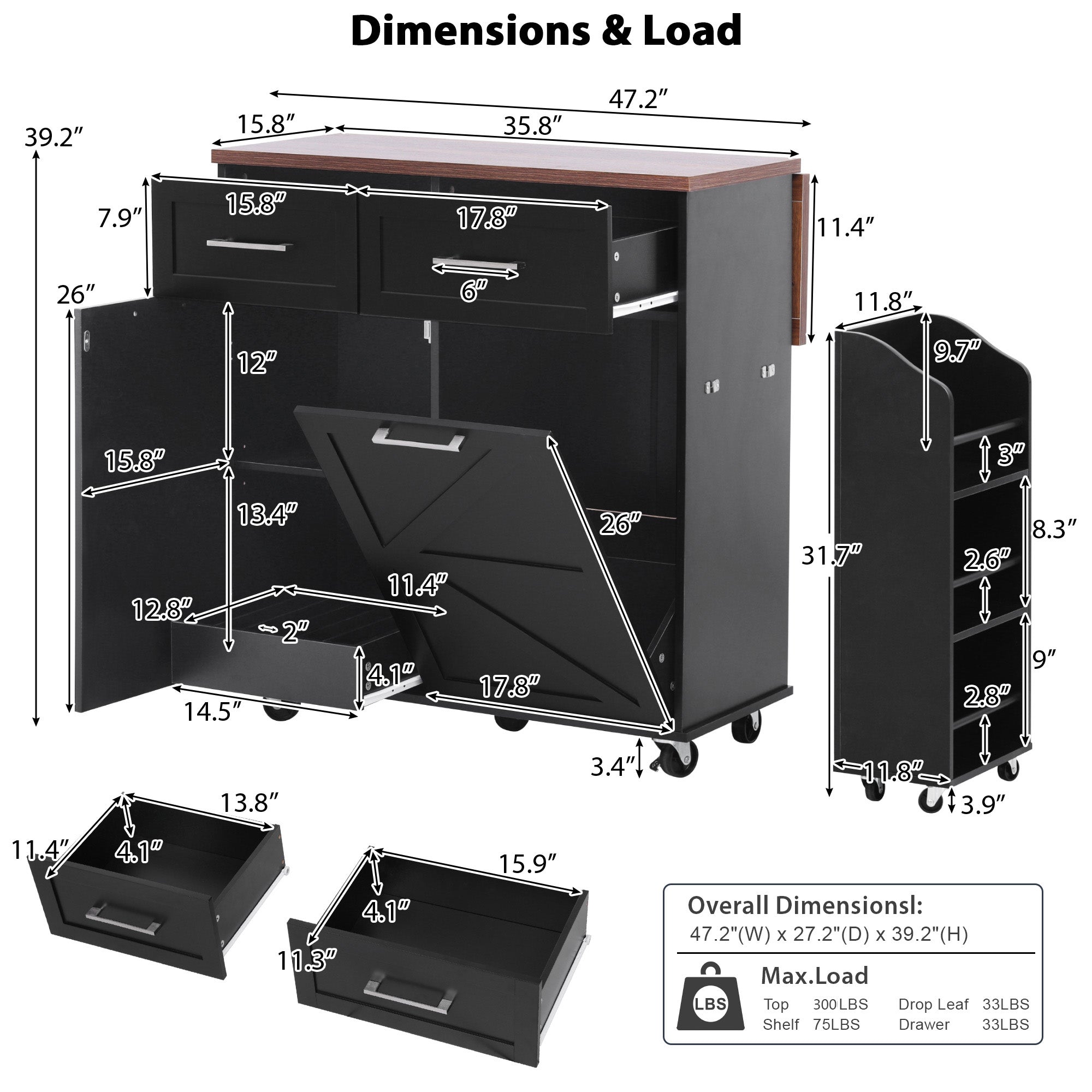 - Drop leaf tabletop: Fold down when not in use to save space; raises instantly to expand prep or dining area. Drop leaf capacity: 33 lbs. Tabletop capacity: 300 lbs.