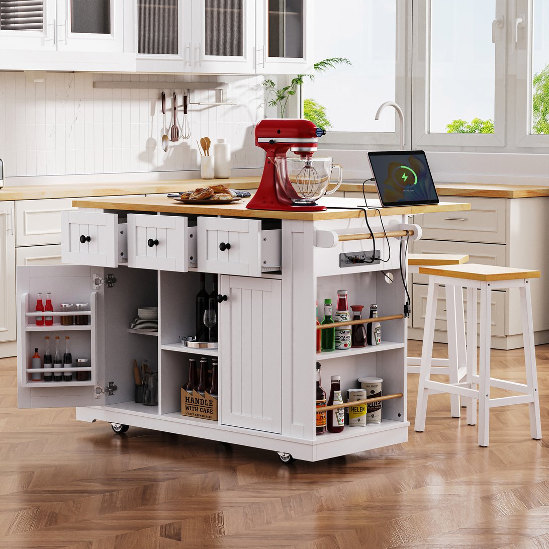 Bring professional functionality and classic style to your kitchen or dining area with this versatile 53-inch mobile kitchen island. Designed for cooking, serving, and storage, it combines a durable work surface, configurable interior shelving, integrated power outlets, and thoughtful details like soft-close hinges and hidden caster wheels — all intended to simplify meal prep and keep essentials organized and accessible.