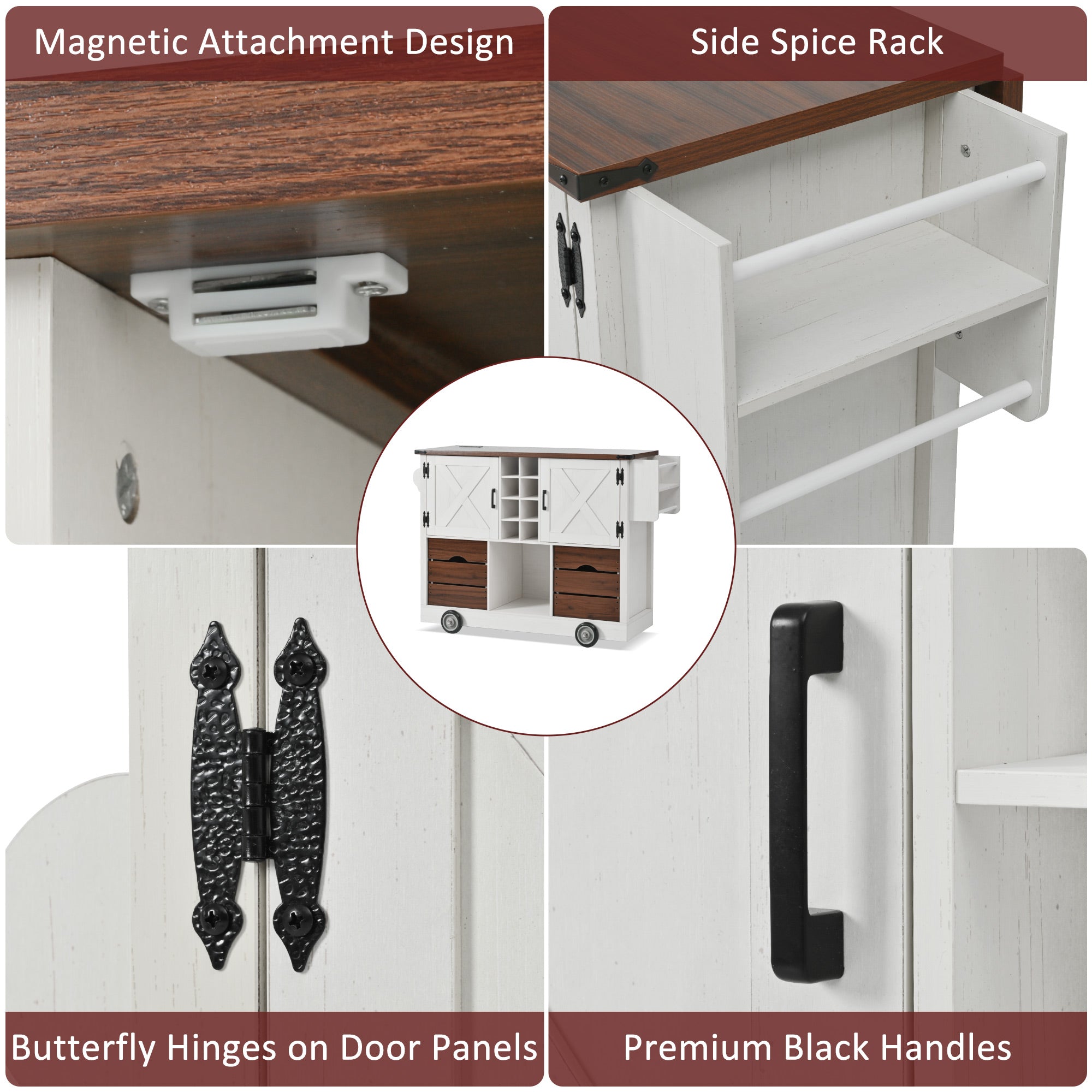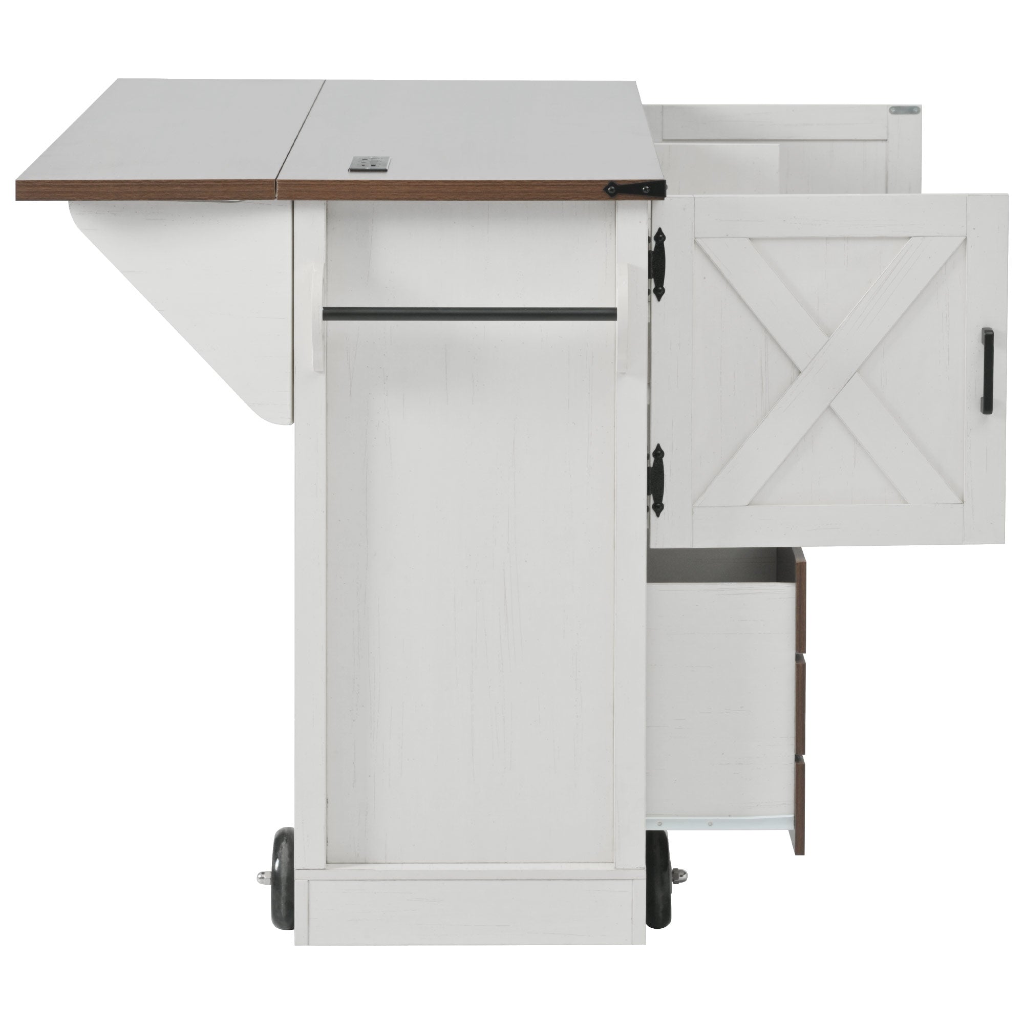 Bring farmhouse warmth and modern convenience to your kitchen or dining area with this versatile 54-inch farmhouse kitchen island. Designed for prep, serving, storage and mobility, it blends distressed white cabinetry with a walnut-tone tabletop, vintage metal accents and practical features like a drop leaf, integrated power ports and ample organized storage—making it an attractive focal point and a hardworking workhorse for busy homes.