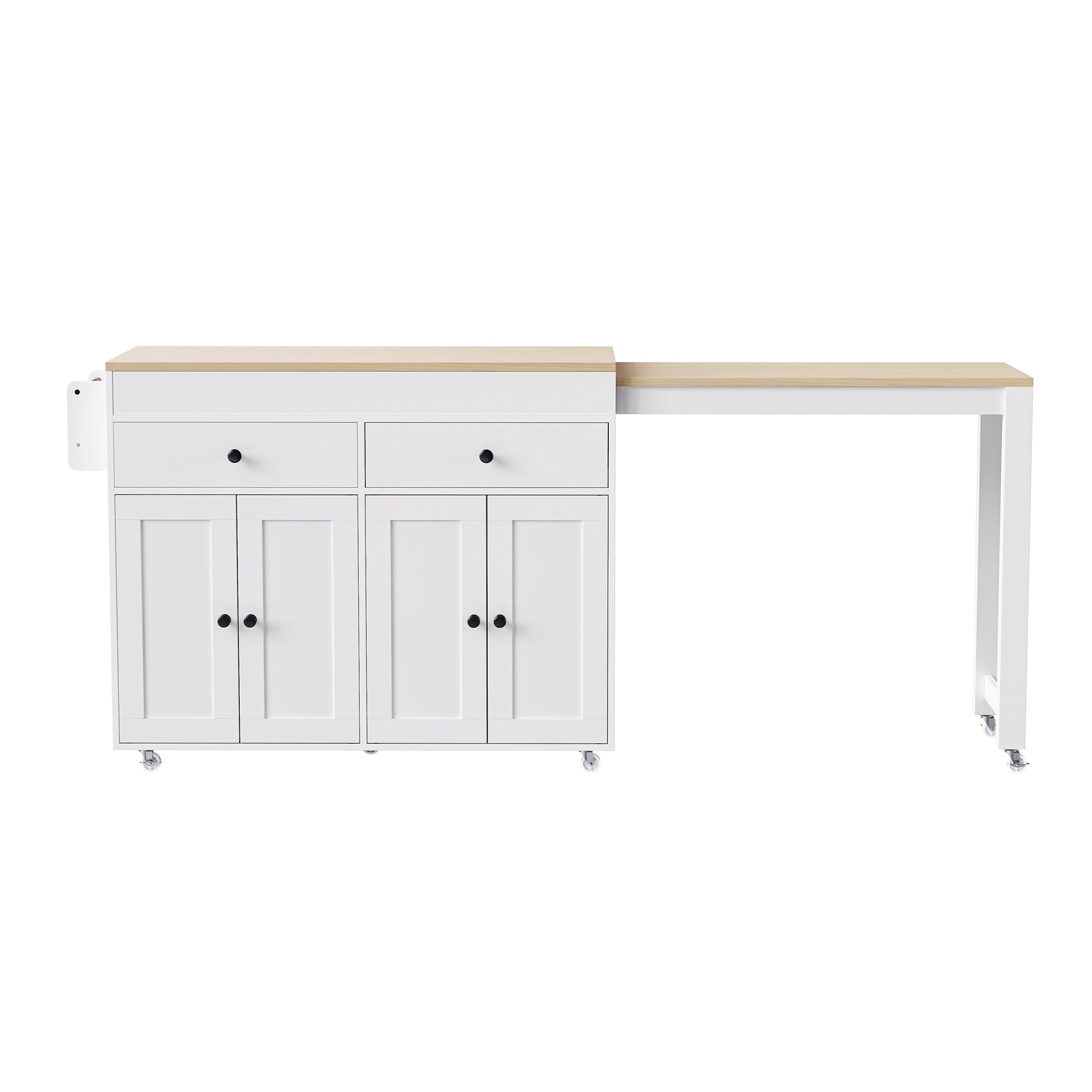 - [Ample Storage Space]First of all the extended dining table is able to optimize the use of available space effectively. Secondly, the kitchen island is equipped with four-door cabinets and two large storage drawers, so you don't have to worry about running out of space. The side spice rack and the shelves in the cabinet allow for a wide variety of using space and the ability to place different items according to your needs, giving you the freedom to organize your kitchen storage.
