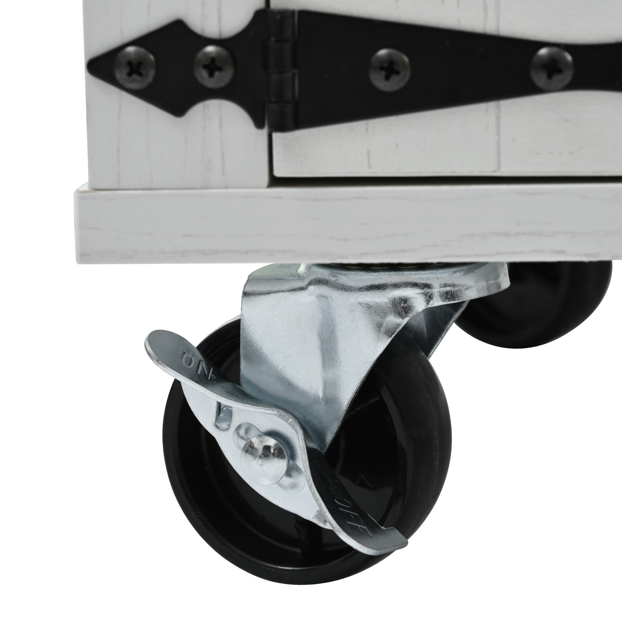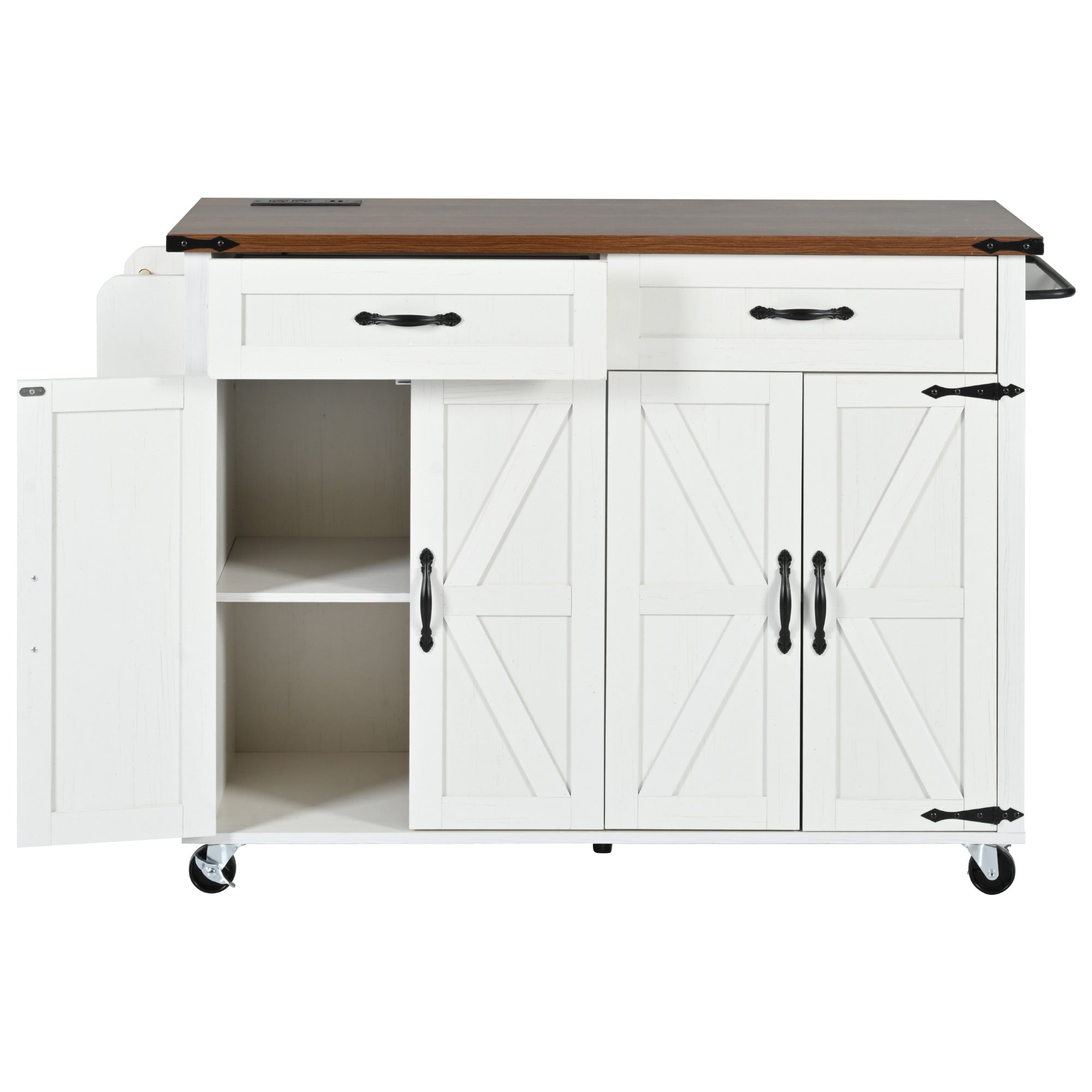 Bring farmhouse charm and modern convenience to your kitchen with this versatile rolling kitchen island. Designed for busy cookspaces and casual dining areas, it combines generous storage, a durable work surface, and integrated power to keep appliances and devices easily accessible. The drop-leaf countertop expands your prep or serving space when needed and folds away to save room, while lockable casters let you reposition the island wherever you need it.