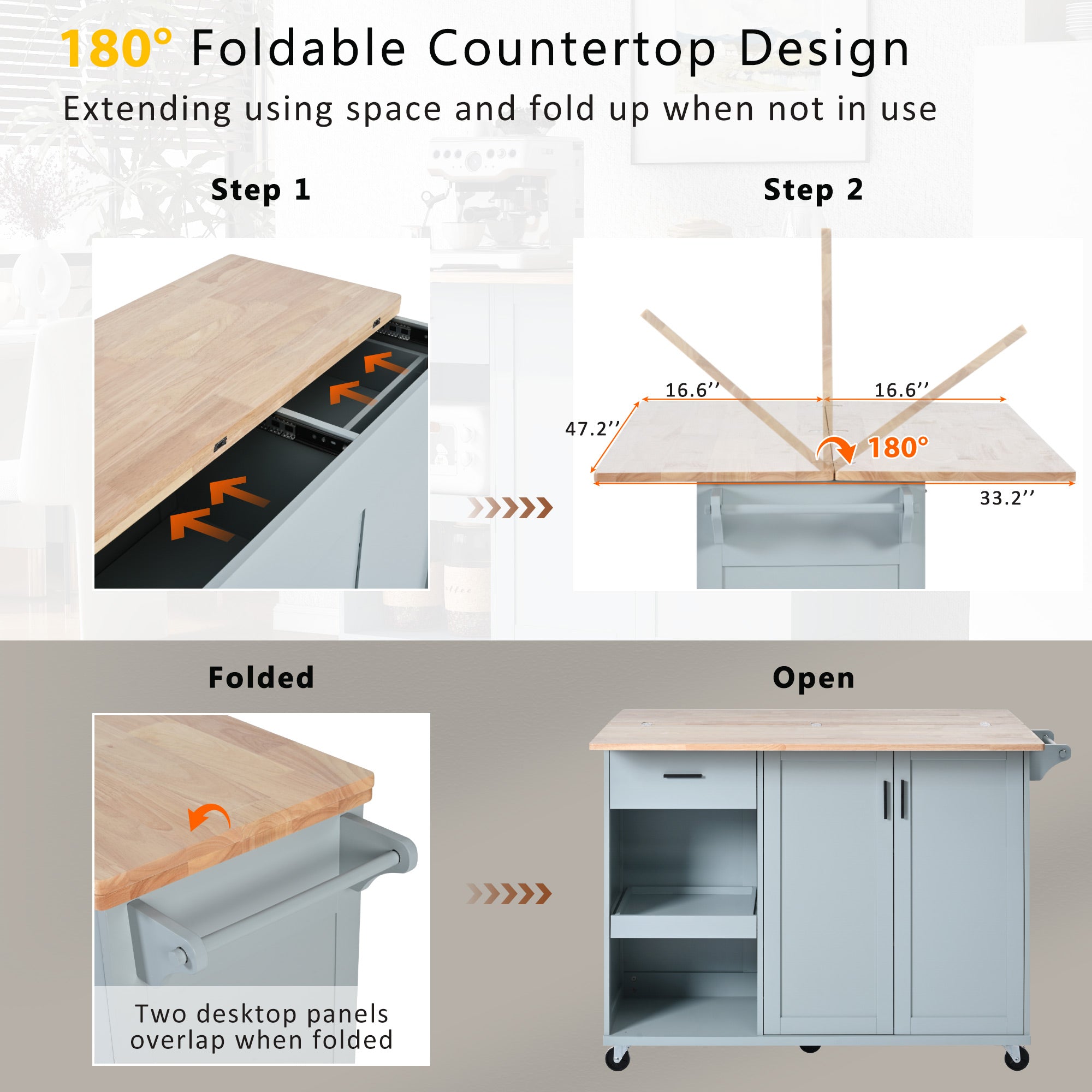 - [Convenient Folding Counter Top] The kitchen island's countertop can be used when folded or opened for wider use. When the countertop is not open, you can use a metal latch on the back to lock it in place. This way you can prepare food on the 47.24 "x16.57" countertop, which you can easily use without having to walk back and forth. If you open the countertop, the 47.24 " x 33.15" countertop can accommodate more kitchen tools for you to operate, instantly upgrading your use space.