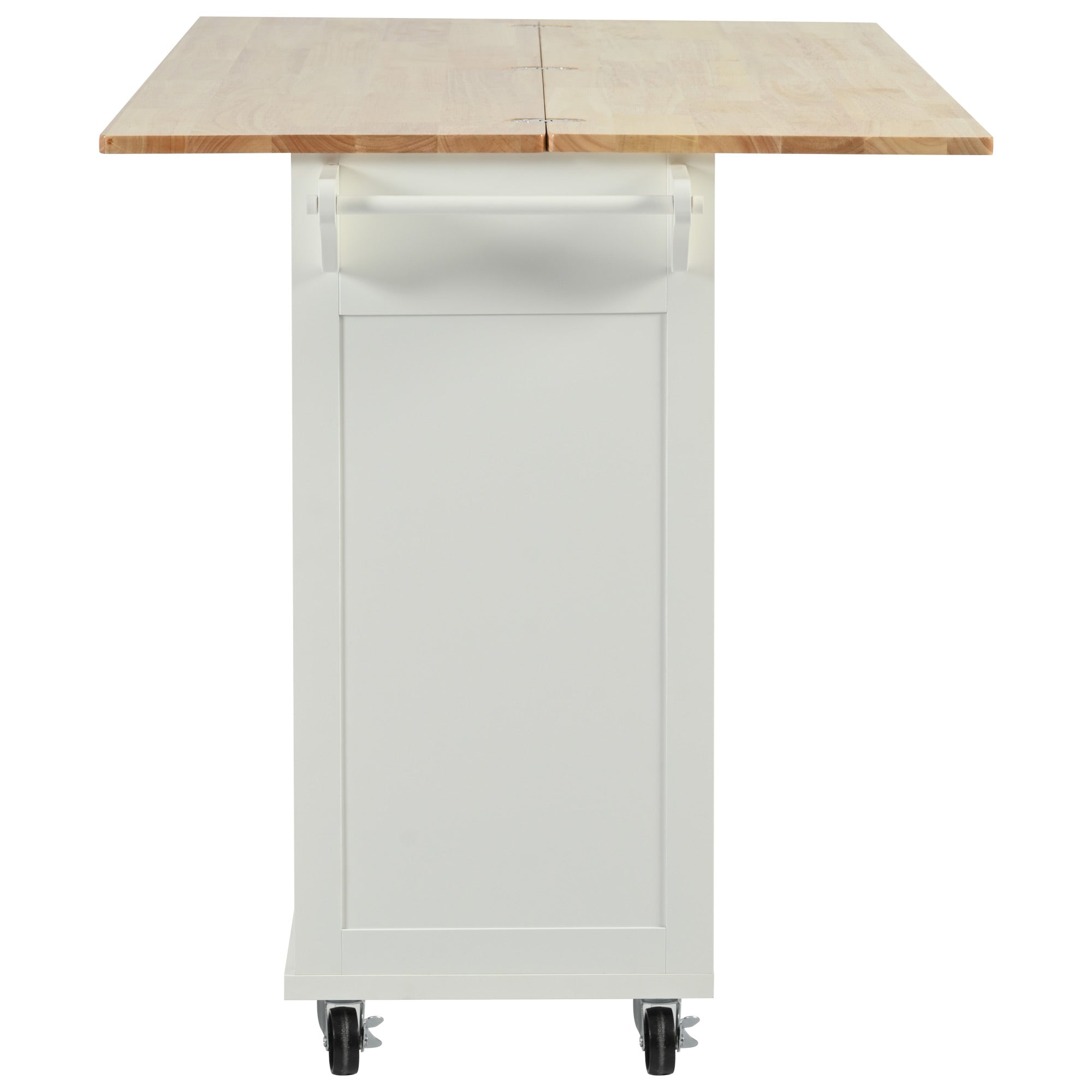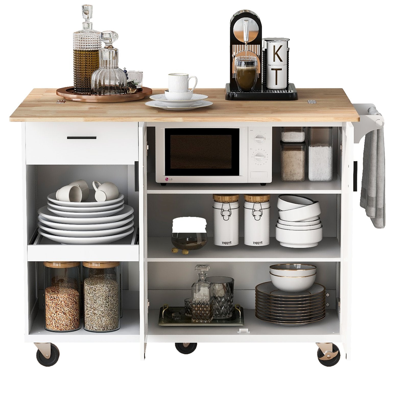 Bring functional style to your kitchen, dining or living space with this versatile rolling island designed for meal prep, storage and flexible serving. The foldable countertop expands your workspace in seconds, while adjustable shelving, a slide-out shelf and drawer keep utensils and appliances organized. Built on smooth 360° caster wheels with two locks and crafted from rubberwood and eco-friendly MDF, this cart combines durability with mobility for everyday use.