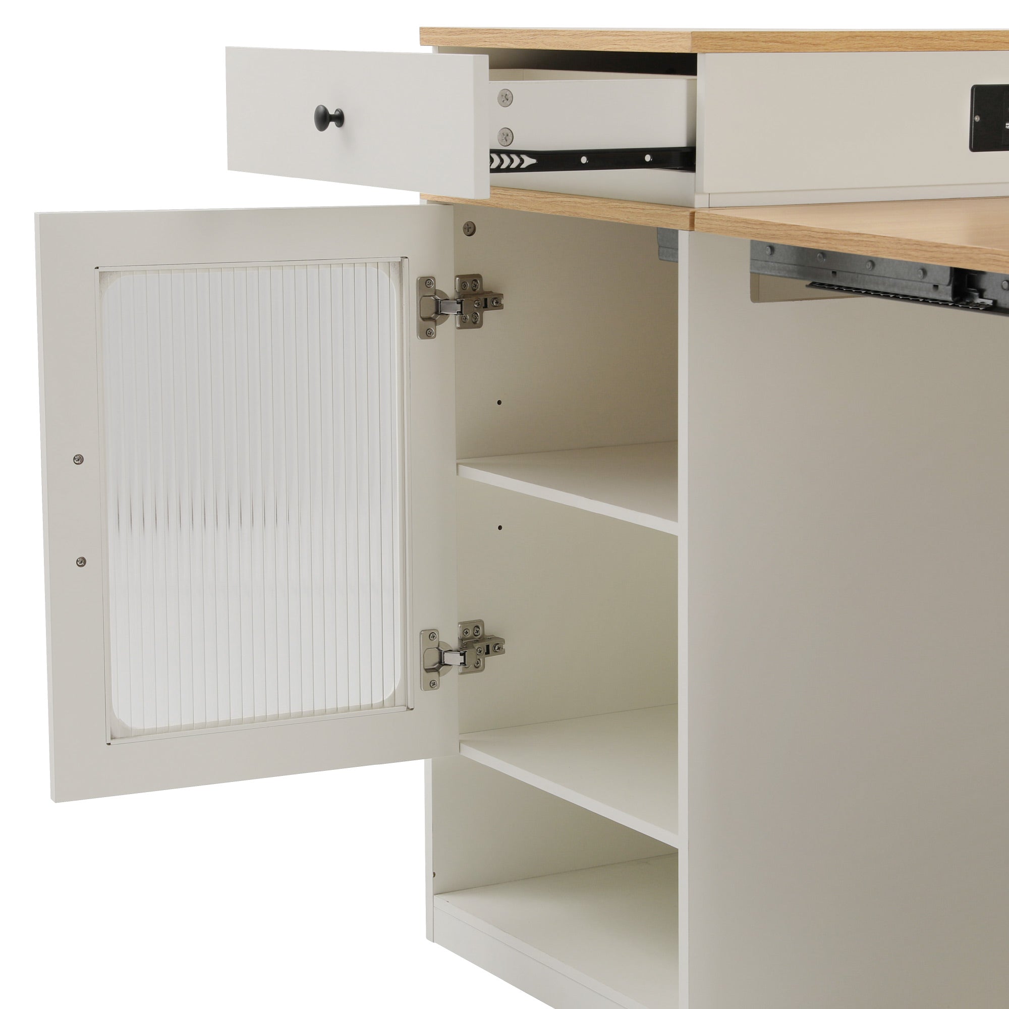 Bring modern functionality and versatile storage to your kitchen or dining space with this elegantly designed island and extendable table. Clean white cabinetry paired with a natural wood-toned countertop creates a warm, minimalist look while smart features — including a built-in power station, double-sided storage, adjustable shelving, and removable tabletop panels — make this piece as practical as it is attractive.