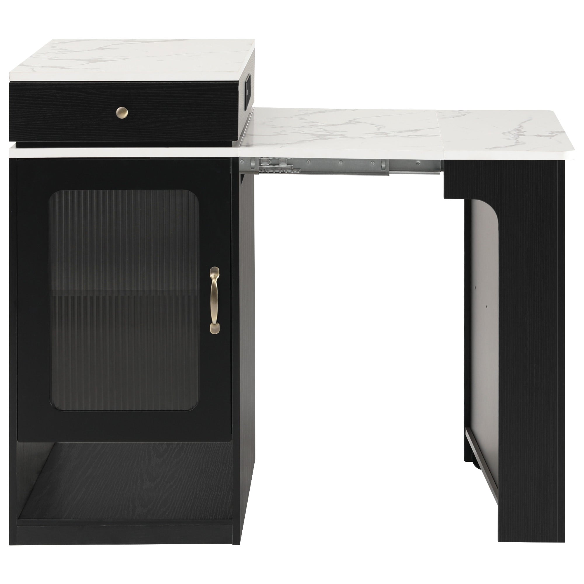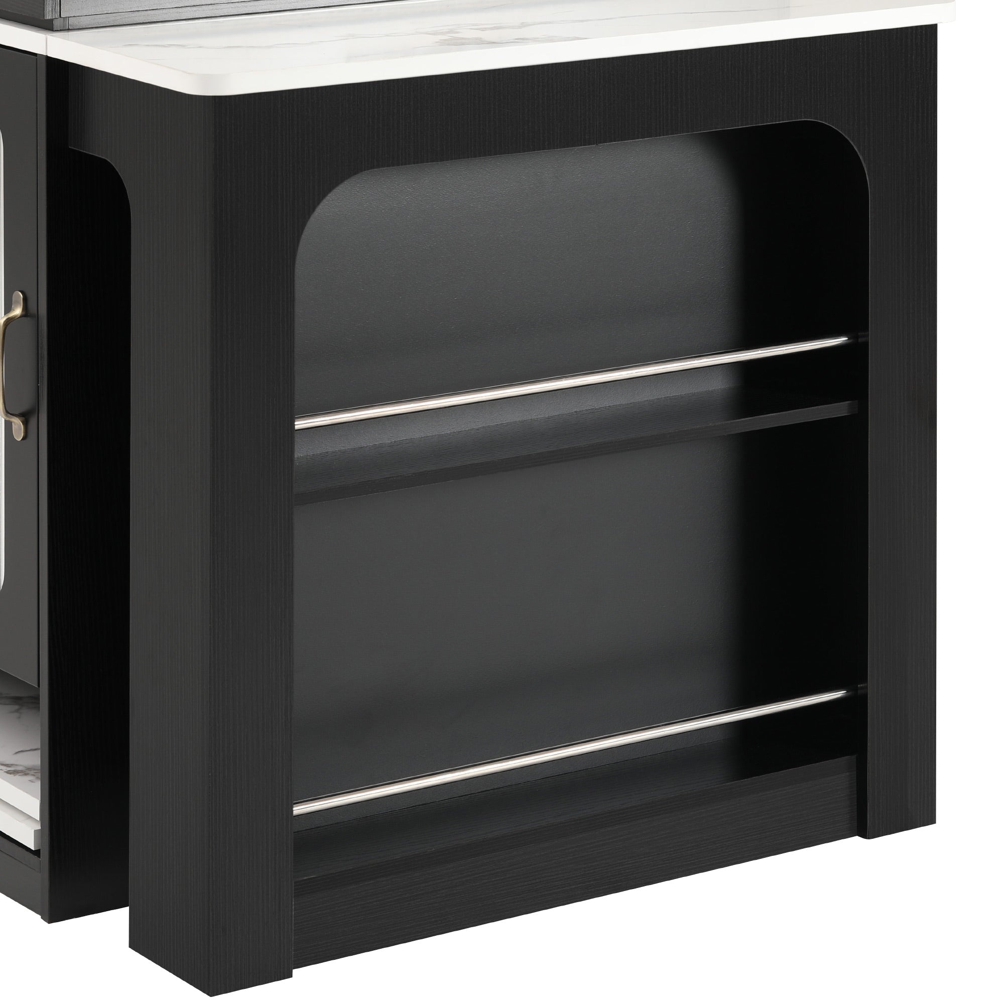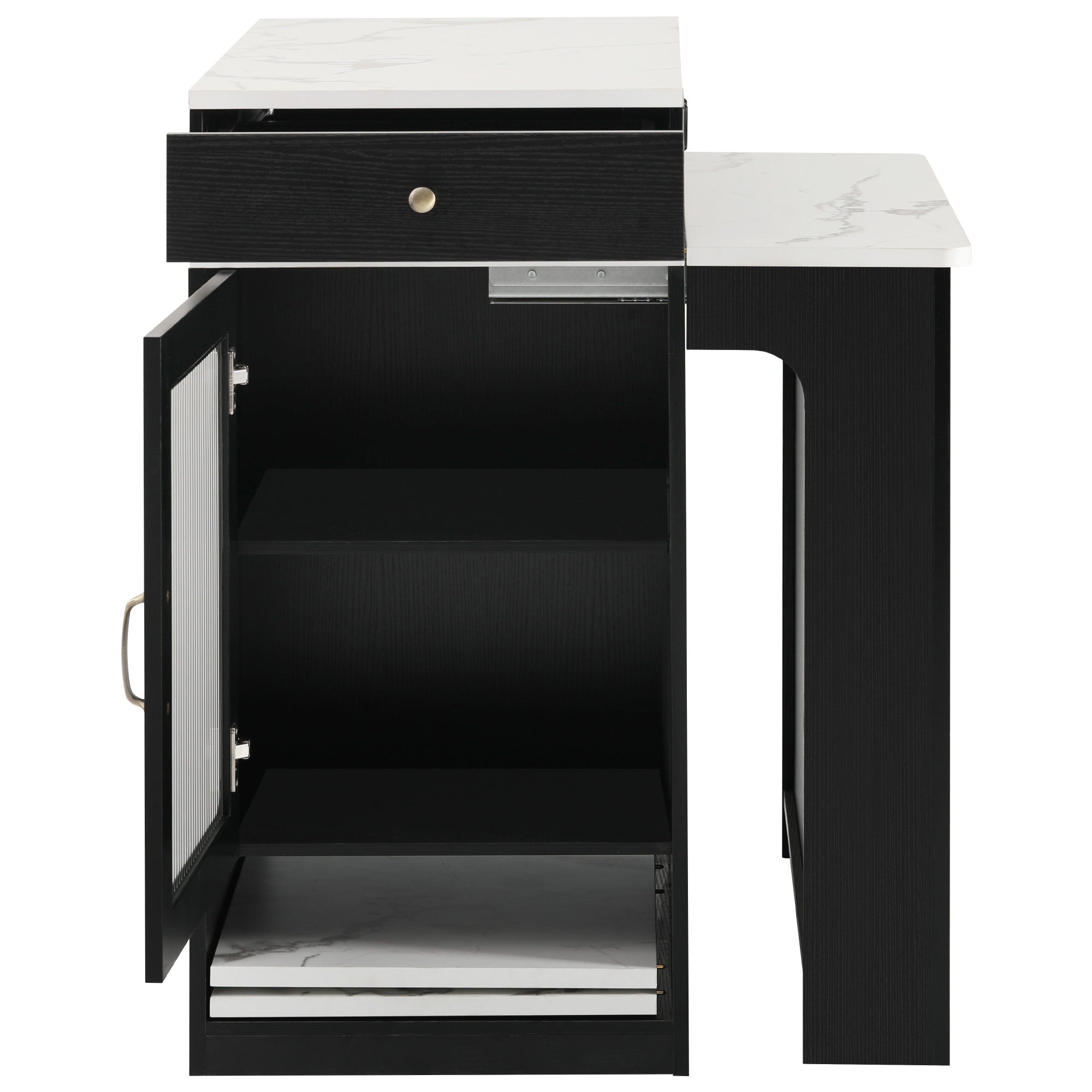 - [Double-sided Storage Design] This kitchen island features an innovative double-sided storage design that maximizes limited kitchen space. Each side features a drawer, with one side housing a cabinet with an adjustable shelf and a glass door, while the other side offers open shelving. Whether faces left or right, the island provides ample usable space from every angle. It also includes a convenient two-tiered side storage area on the extended dining table, making it easy to access condiments and