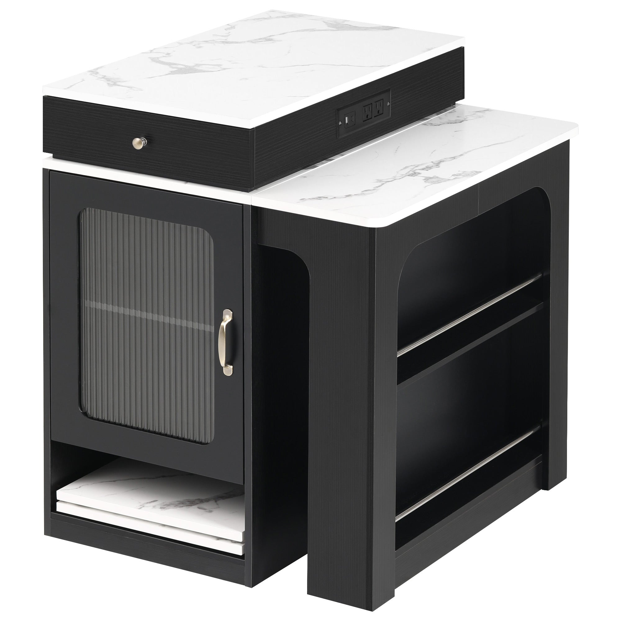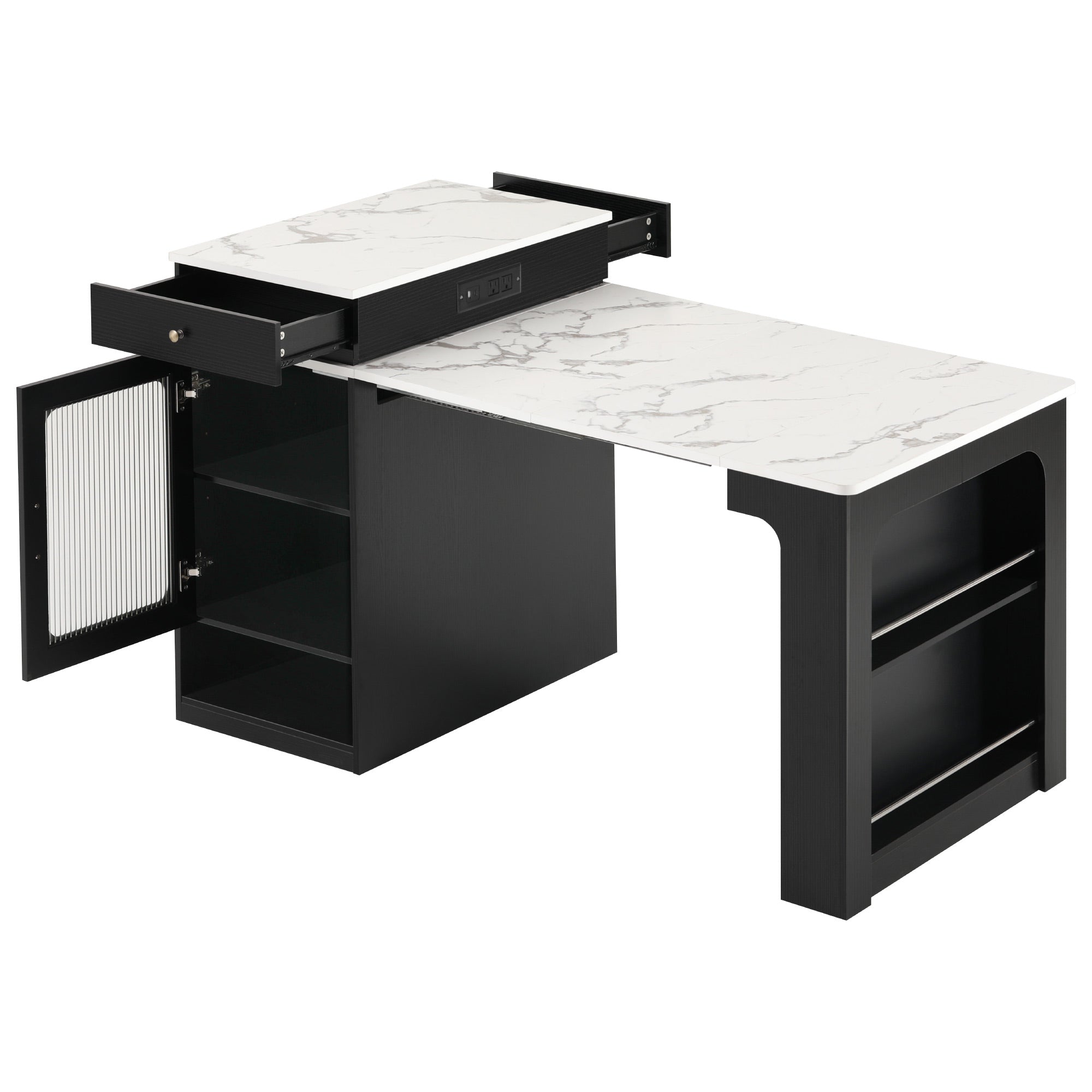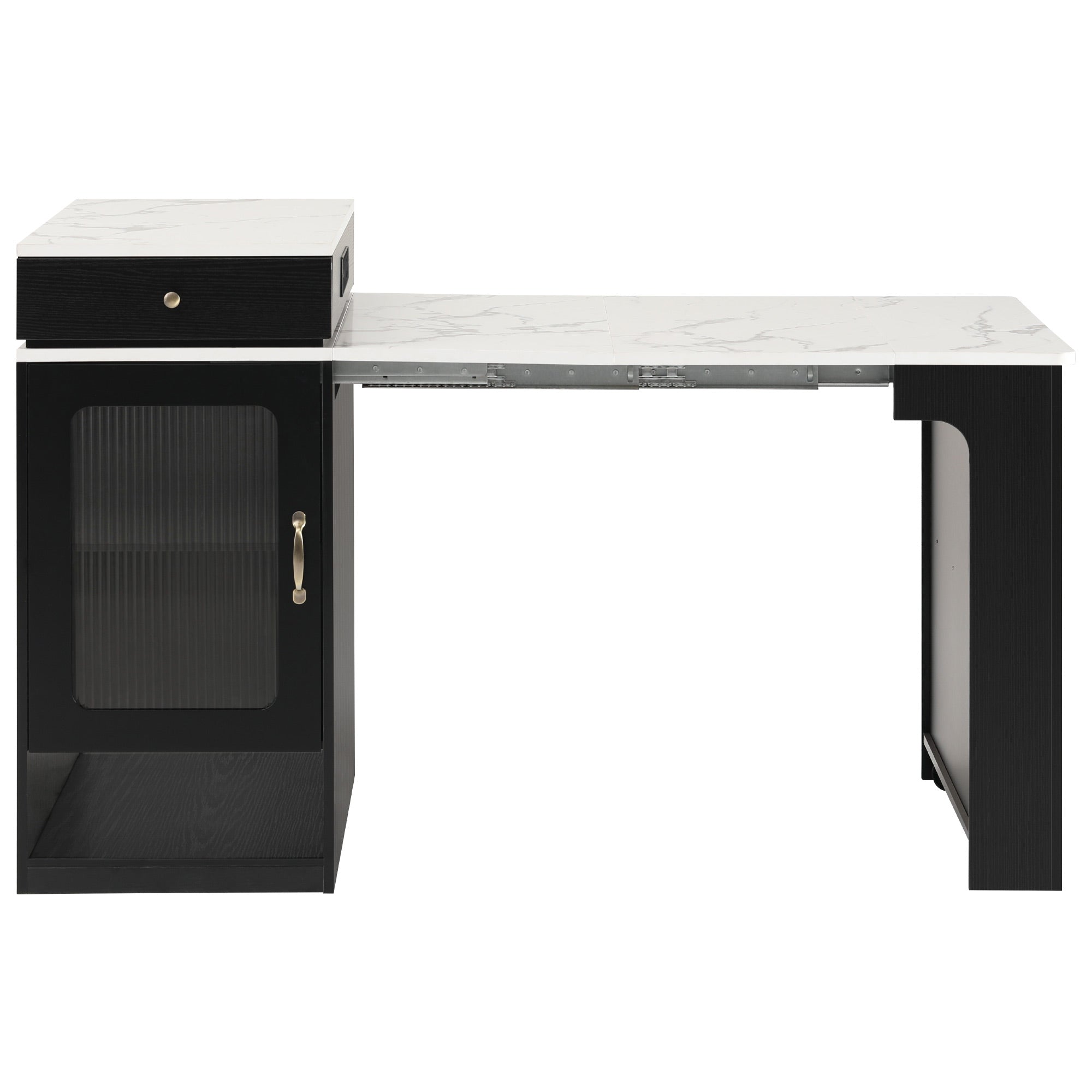 - [Double-sided Storage Design] This kitchen island features an innovative double-sided storage design that maximizes limited kitchen space. Each side features a drawer, with one side housing a cabinet with an adjustable shelf and a glass door, while the other side offers open shelving. Whether faces left or right, the island provides ample usable space from every angle. It also includes a convenient two-tiered side storage area on the extended dining table, making it easy to access condiments and