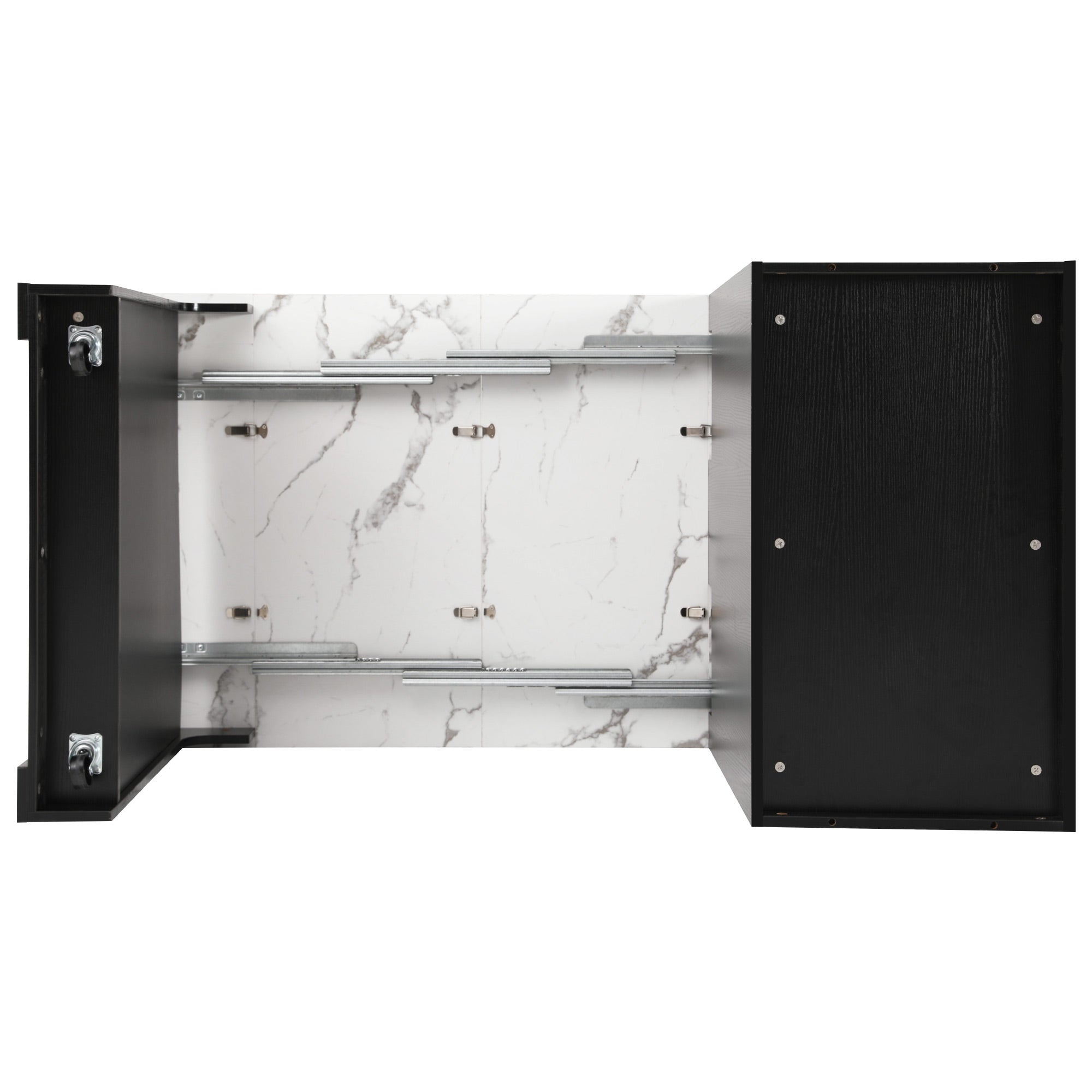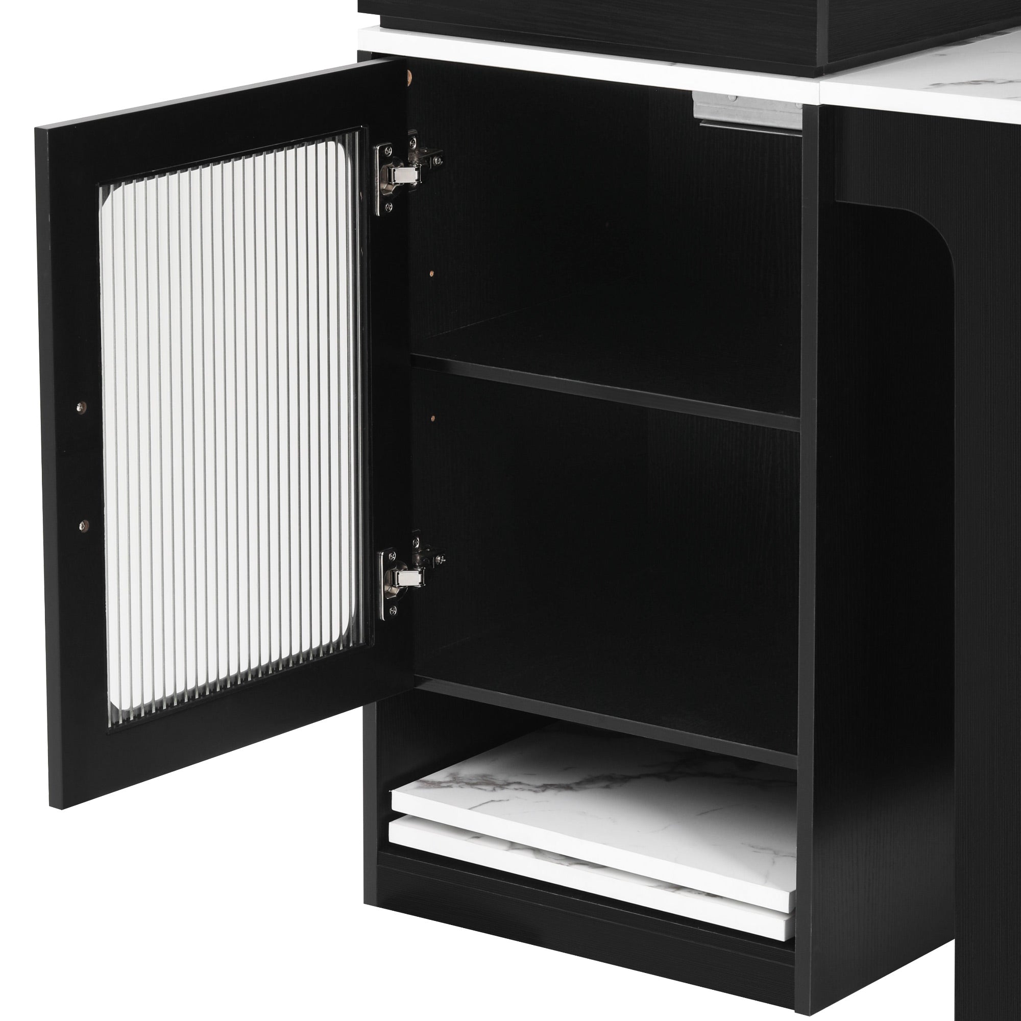 - Double-sided storage: Mirror-image storage on both sides includes two drawers, one glass-door cabinet with adjustable shelf, and open shelving on the opposing side for versatile organization.