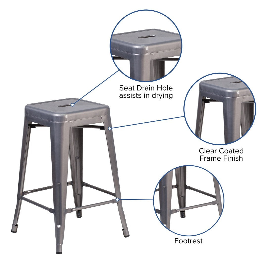 Bring modern industrial flair and practical durability to your kitchen, café, or bar with this sleek backless counter-height stool. Its minimalist silhouette and clear-coated silver finish complement contemporary and vintage-inspired interiors while offering commercial-grade strength and space-saving stackability for easy storage and maintenance.