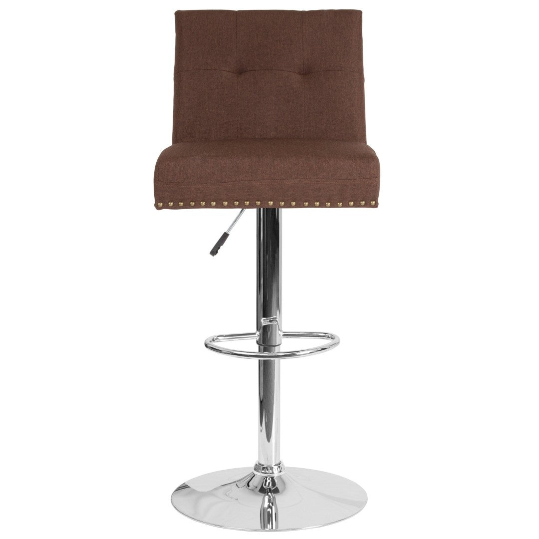 Give your kitchen or home bar an instant style upgrade with this contemporary brown fabric barstool. Padded for comfort and trimmed with decorative nailheads, it blends modern chrome accents and classic curved lines for a versatile look that complements both transitional and contemporary interiors. The gas-lift swivel mechanism lets you move easily between counter and bar heights, and thoughtful details—like a concealed plastic ring on the base—protect floors while keeping the silhouette streamlined.