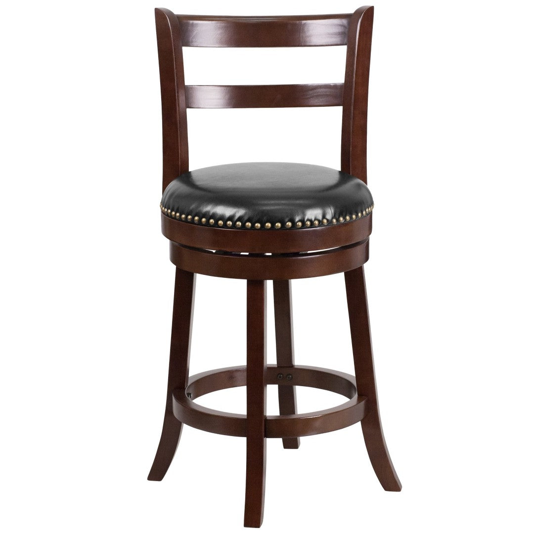 Introduce timeless sophistication to your kitchen, bar, or entertainment area with this elegantly crafted counter-height stool. Combining a classic ladder-back silhouette and cappuccino wood finish with a plush black LeatherSoft swivel seat, it delivers upscale style, lasting comfort, and everyday durability—perfect for casual meals, conversation, or hosting.